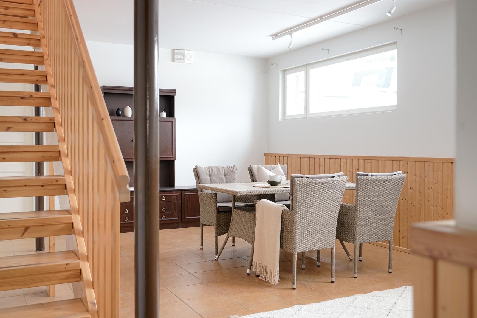 - 92 m2Kellarin/alakerran oleskelutila, tekninen tila, vaatehuone, varastotilat.