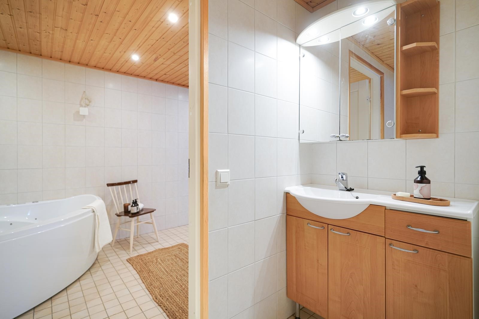 - Sauna, sähkökiuas, kylpyhuone, erillinen wc 3kpl, suihku, suihkuseinä, poreallas, peilit, peilikaappi, kaapit, allaskaappi, pesukoneliitäntä, lattialämmitys Vesikiertoinen, kiinteät valaisimet.