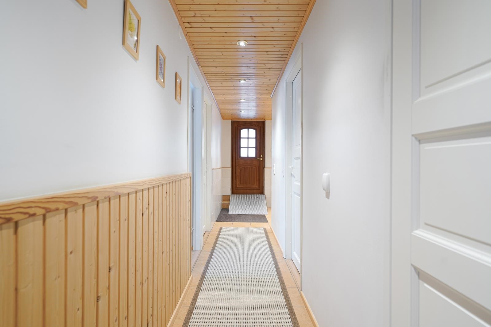 Keittiö: Lattia laatoitettu, seinät maalattu. Olohuone: Lattia laminaattia, seinät maalattu. Makuuhuone 1: Lattia laminaattia, seinät maalattu. Makuuhuone 2: Lattia laminaattia, seinät maalattu. Makuuhuone 3: Lattia laminaattia, seinät maalattu. Kodinhoitohuone: Lattia laatoitettu. Sauna: Paneloitu. Kylpyhuone: Laatoitettu lattia ja seinät. Eteinen: Lattia laatoitettu. Wc: Laatoitettu kaikki vessat.