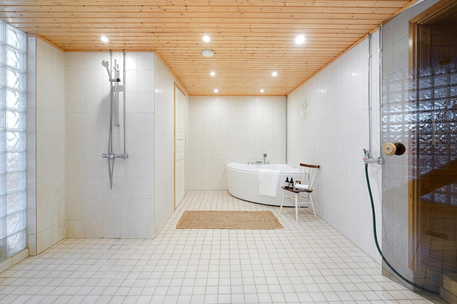 Myös pesutilat ovat alakerrassa, kuljet pesutiloihin pukuhuoneen kautta, astuen suureen kylpyhuoneeseen, joka on varustettu kahdella suihkulla, porealtaalla ja isolla saunalla! Mitä luksusta!
