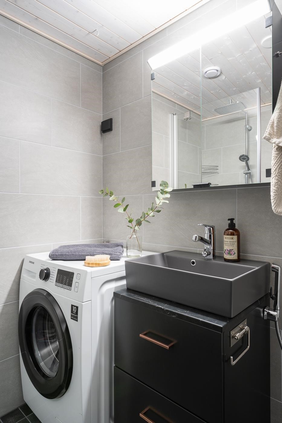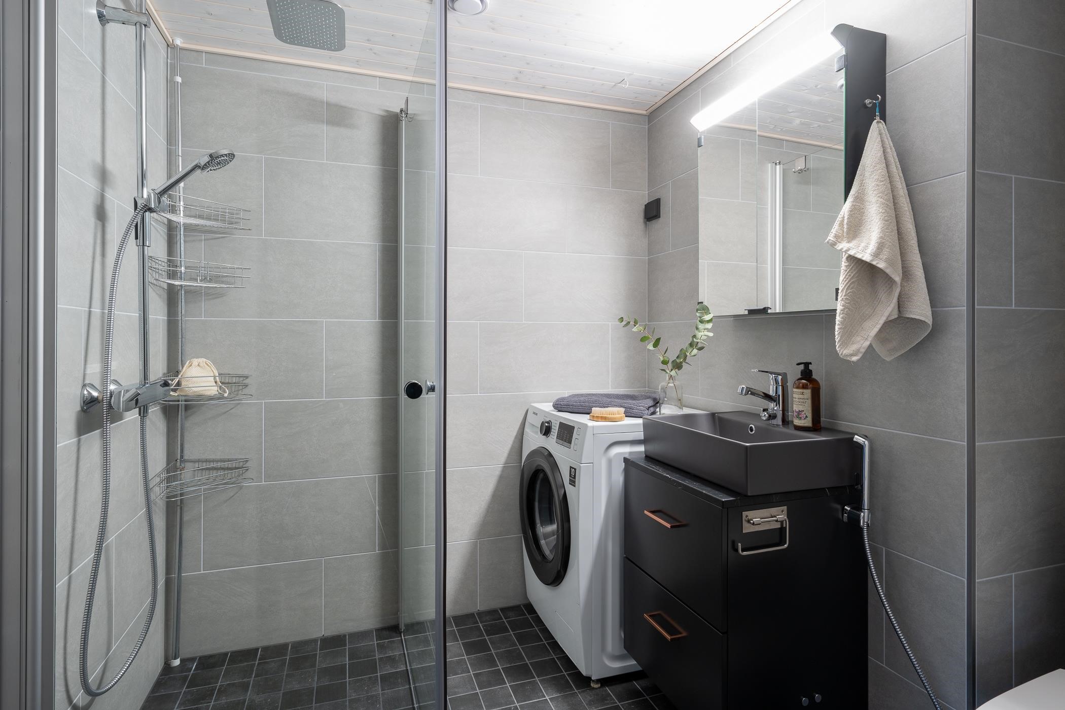 - Sauna, sähkökiuas, kylpyhuone +wc istuin, suihku, suihkuseinä lasiset kääntyvät 2 kpl, peilikaappi, allaskaappi, pesukoneliitäntä, kiinteät valaisimet. Sauna ja pesuhuone juuri peruskorjattu 2024