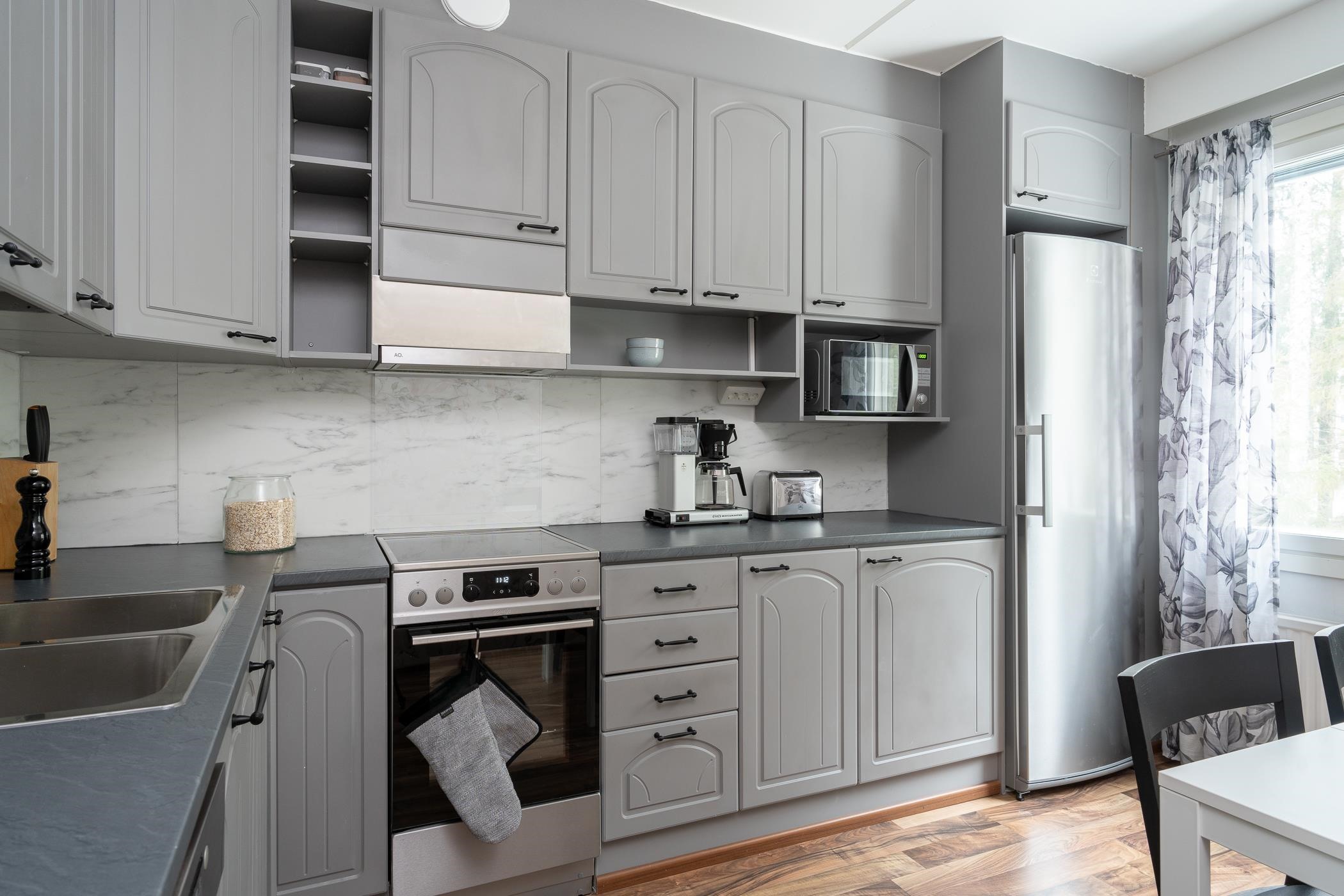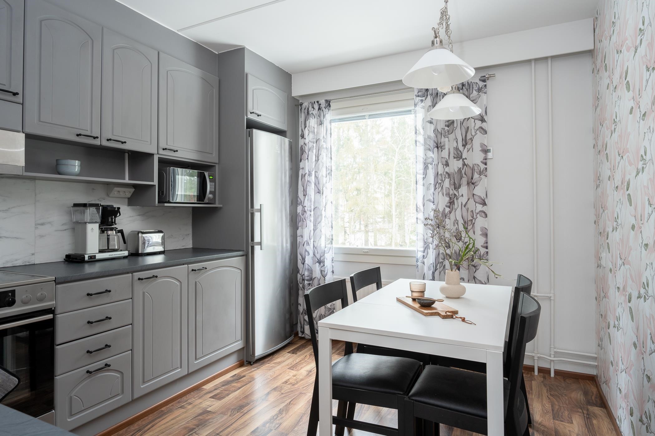 - Jääkaappi, pakastekaappi pieni arkkupakastin vaatehuoneessa, keraaminen liesi, liesituuletin aktiivihiilisuodatin, astianpesukone, kaapistot. Ovet maalattu 2022, tasot vaihdettu, allas ja hana 2024. Kodinkoneet 2021