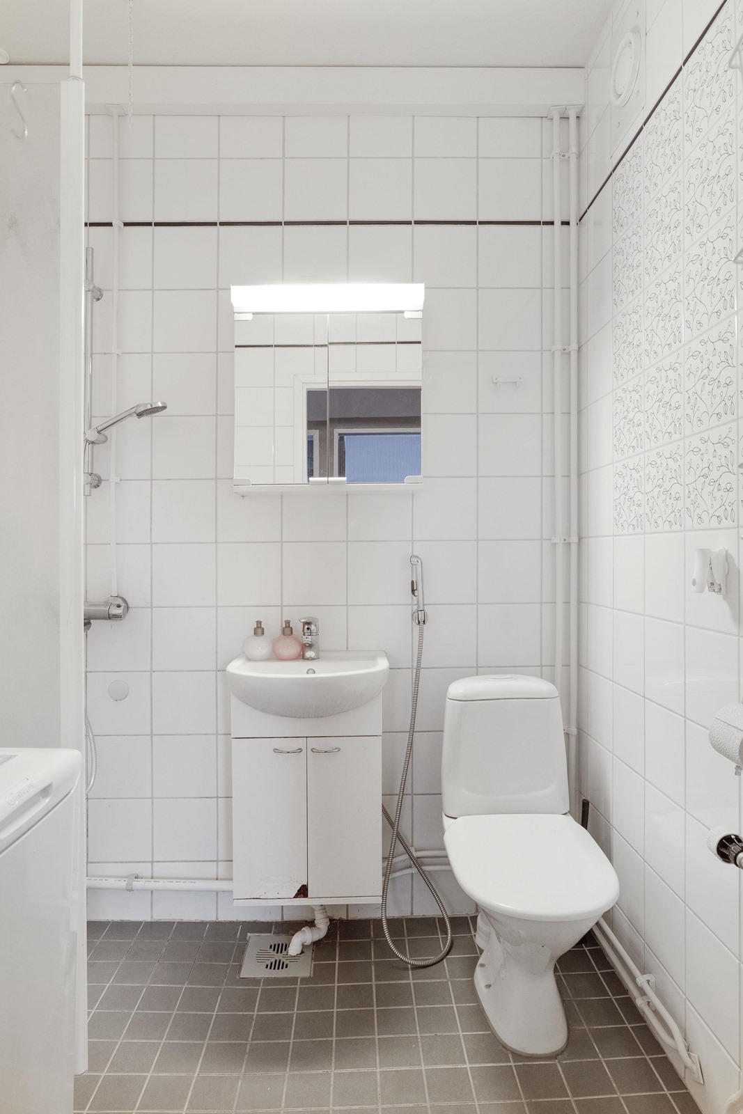 - Kylpyhuone, suihku, suihkuseinä, peilikaappi, allaskaappi, pesukoneliitäntä, kiinteät valaisimet.