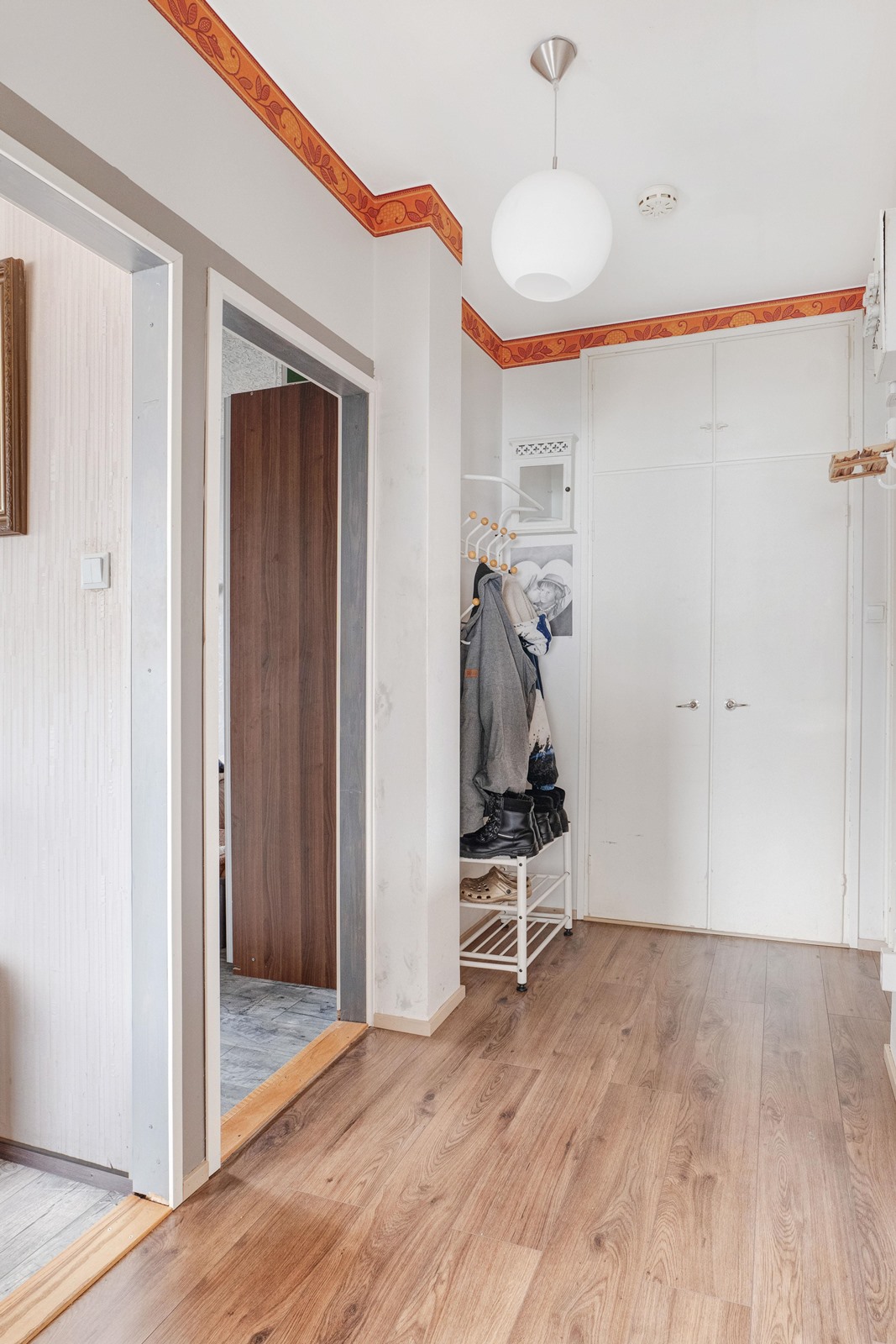 Keittiö: laminaatti (2023), seinät maalattu/laatoitettu. Olohuone: laminaatti, tapetti. Makuuhuone 1: laminaatti, tapetti. Kylpyhuone: laatoitettu. Eteinen: laminaatti (2023), seinät maalattu.