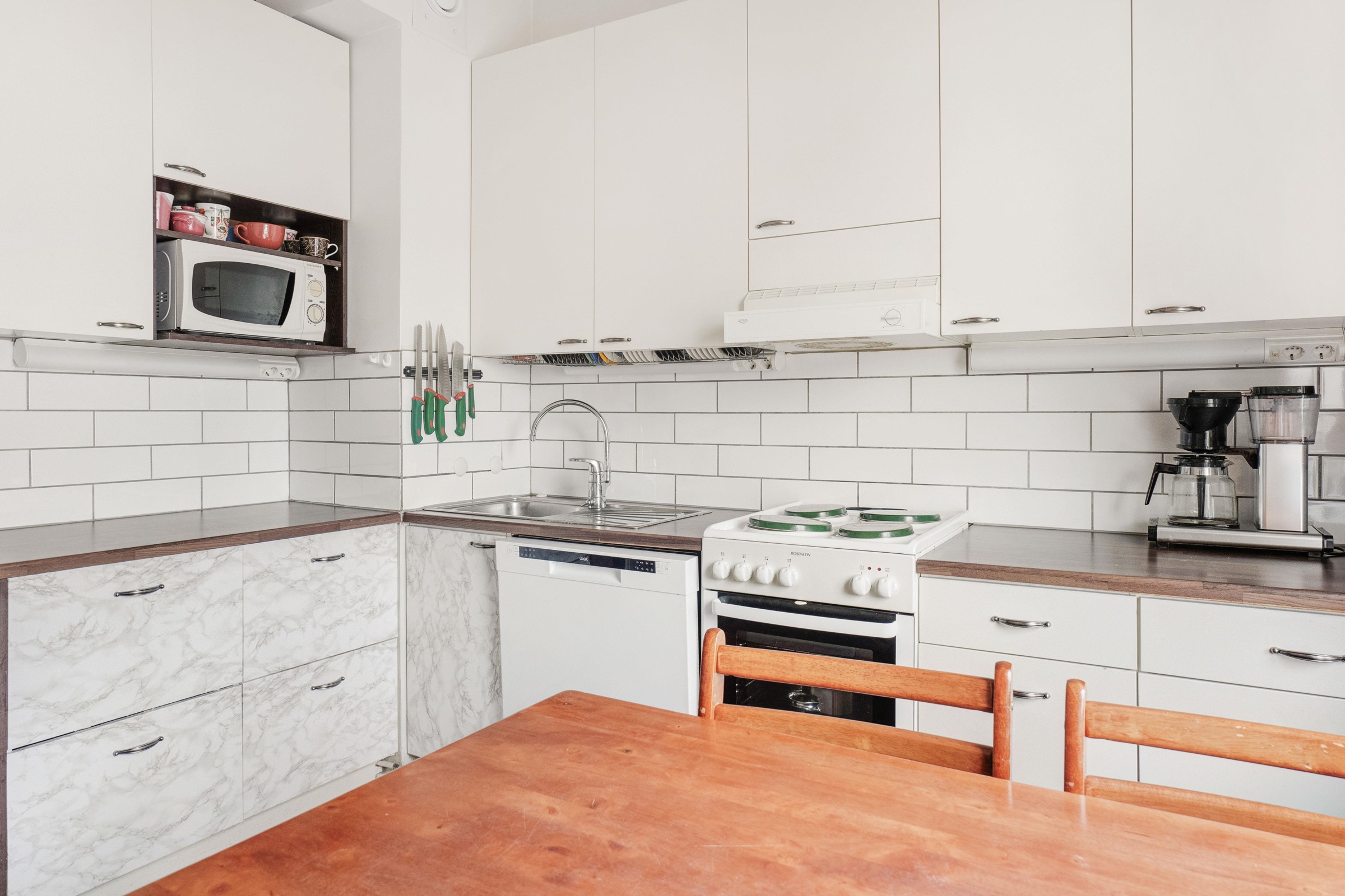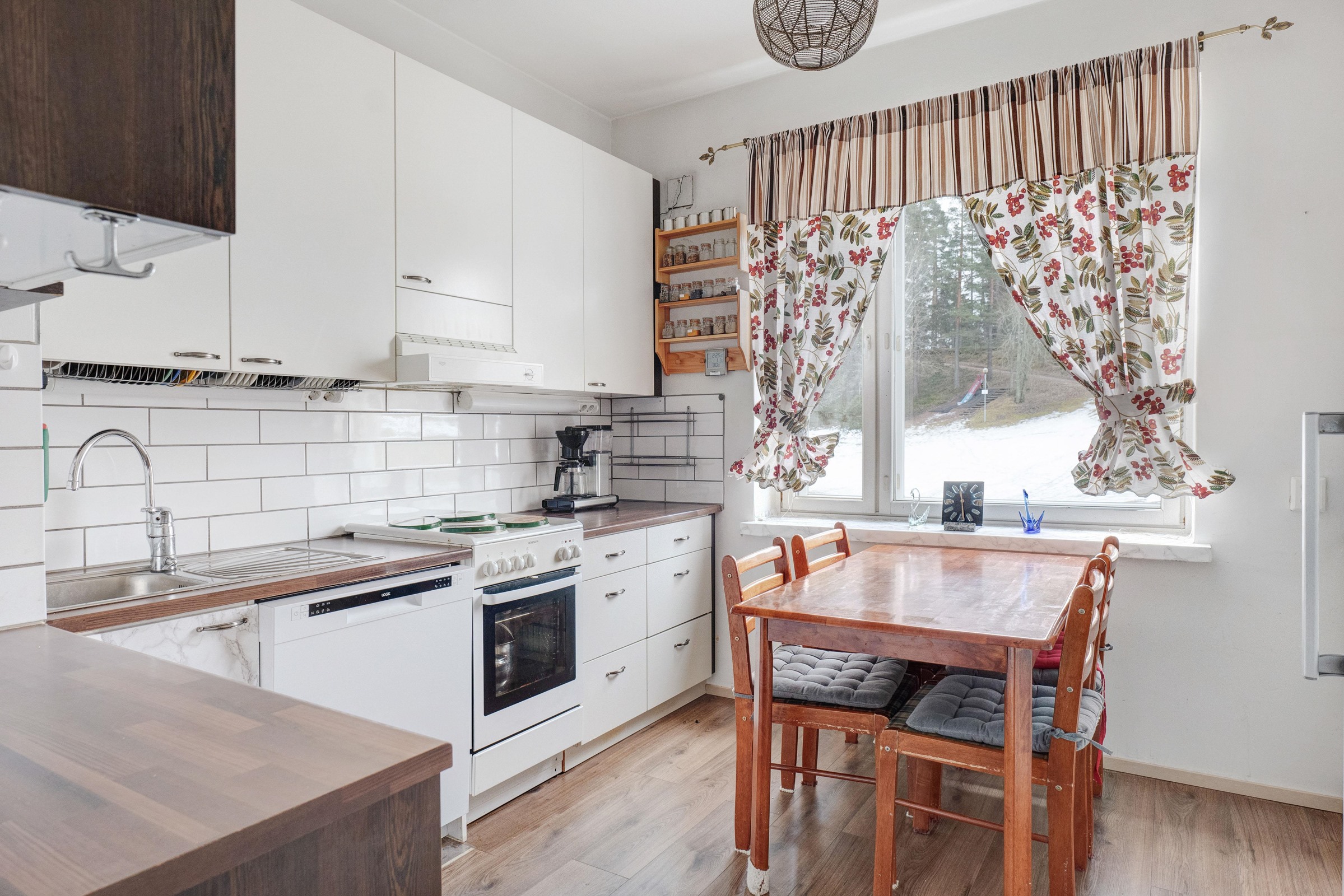 - Jääkaappi, lattialiesi, liesituuletin (aktiivihiilisuodatin), astianpesukone (2023 joulukuussa hankittu), kaapistot, kiinteät valaisimet.