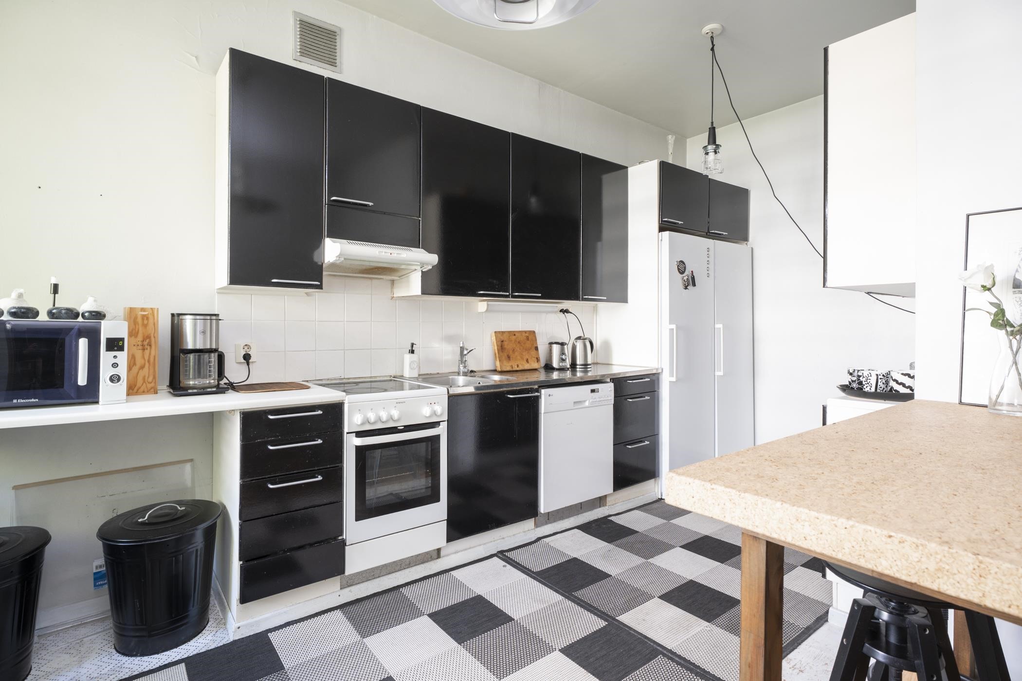 - Jääkaappi, pakastekaappi, keraaminen liesi, liesikupu, astianpesukone, kaapistot.