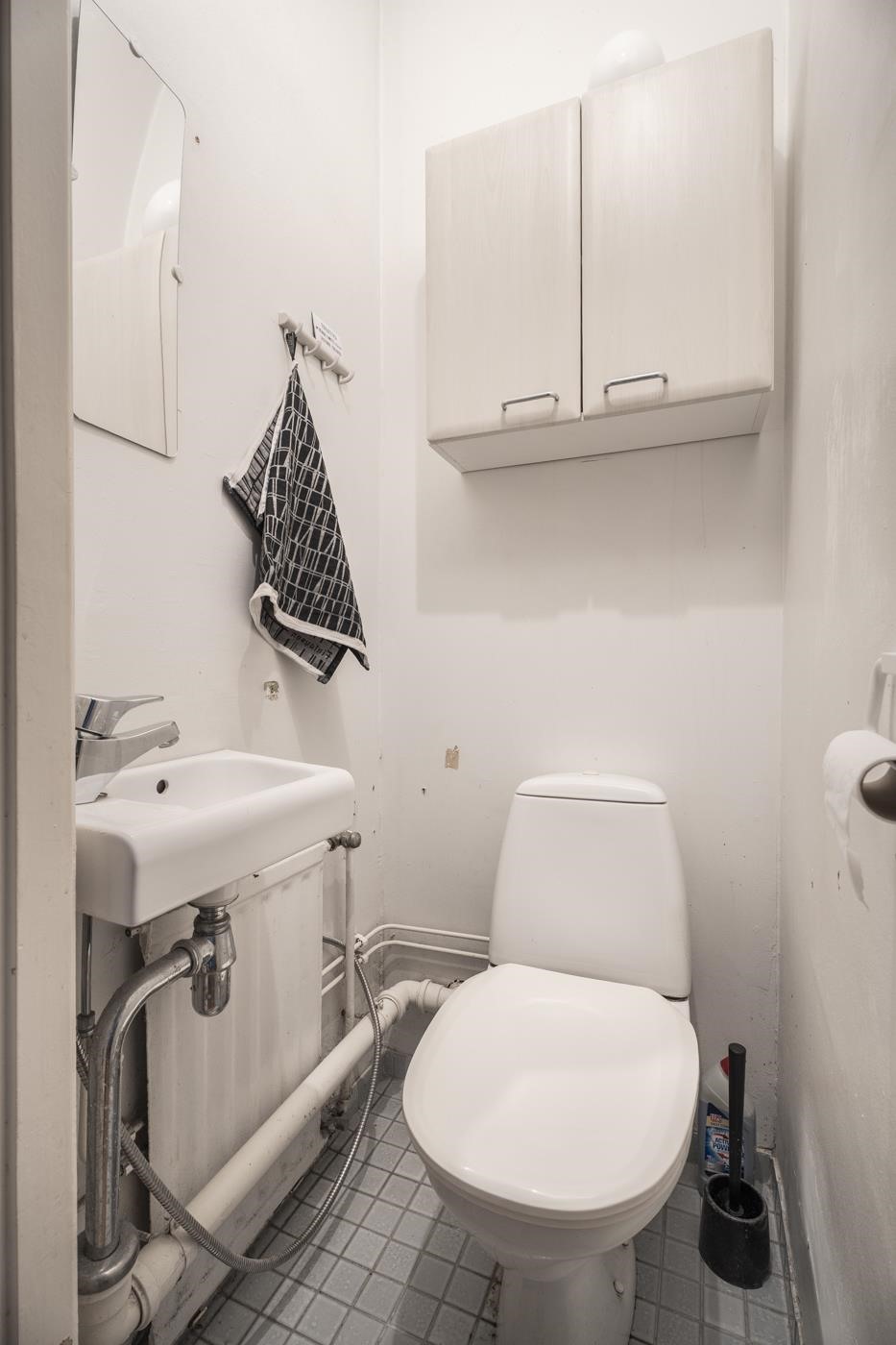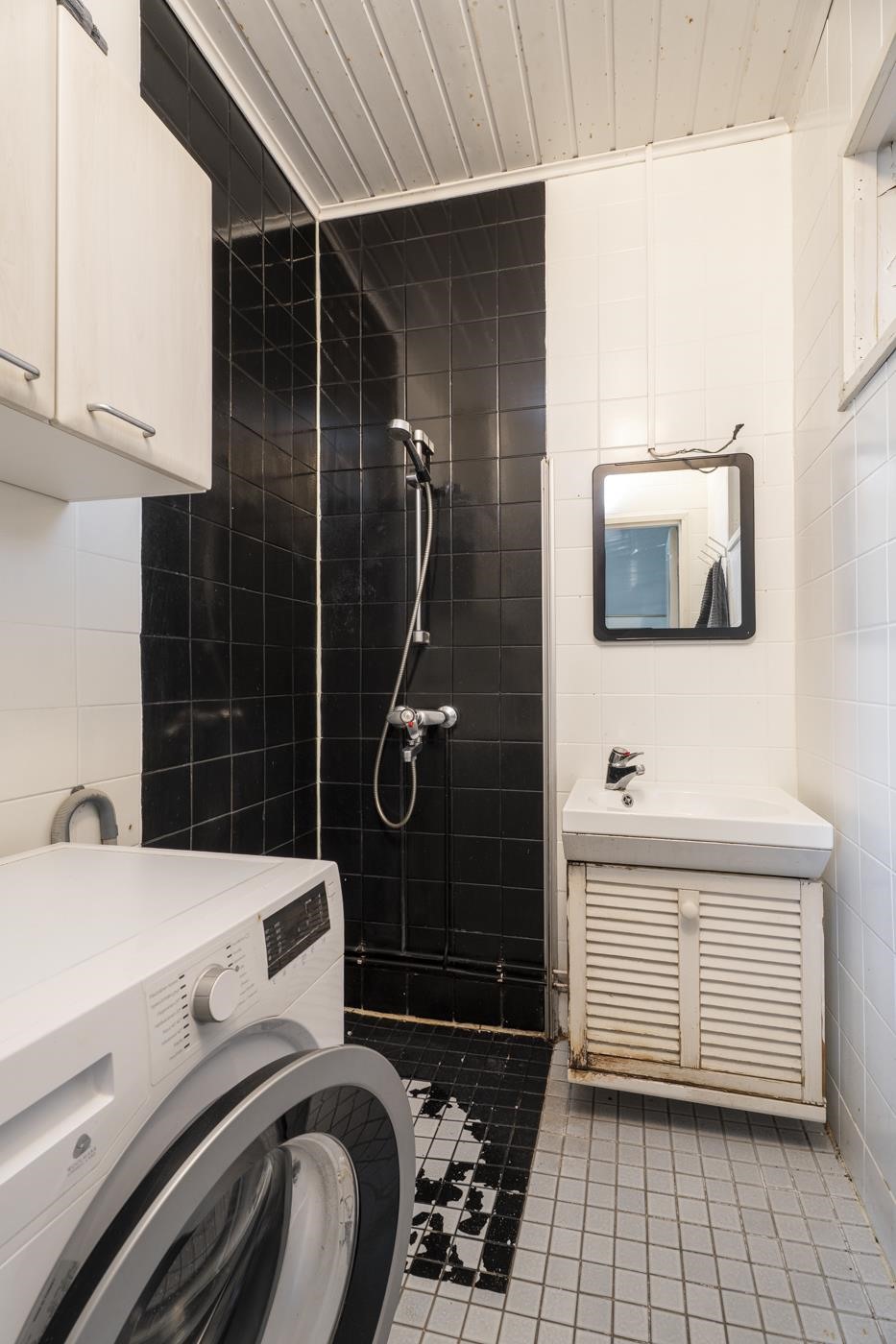 - Kylpyhuone, erillinen wc, suihku, peilit kph:ssa ja wc:ssä, kaapit wc:ssä, allaskaappi kph:ssa, pesukoneliitäntä, kiinteät valaisimet. Kylpyhuone osittain maalattu kaakelimaalilla.