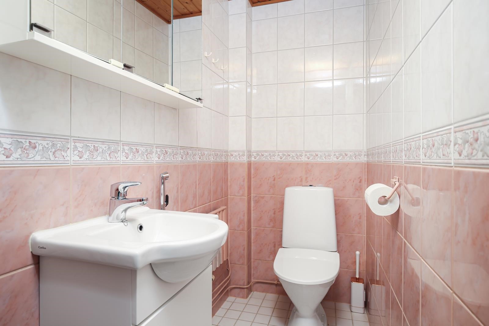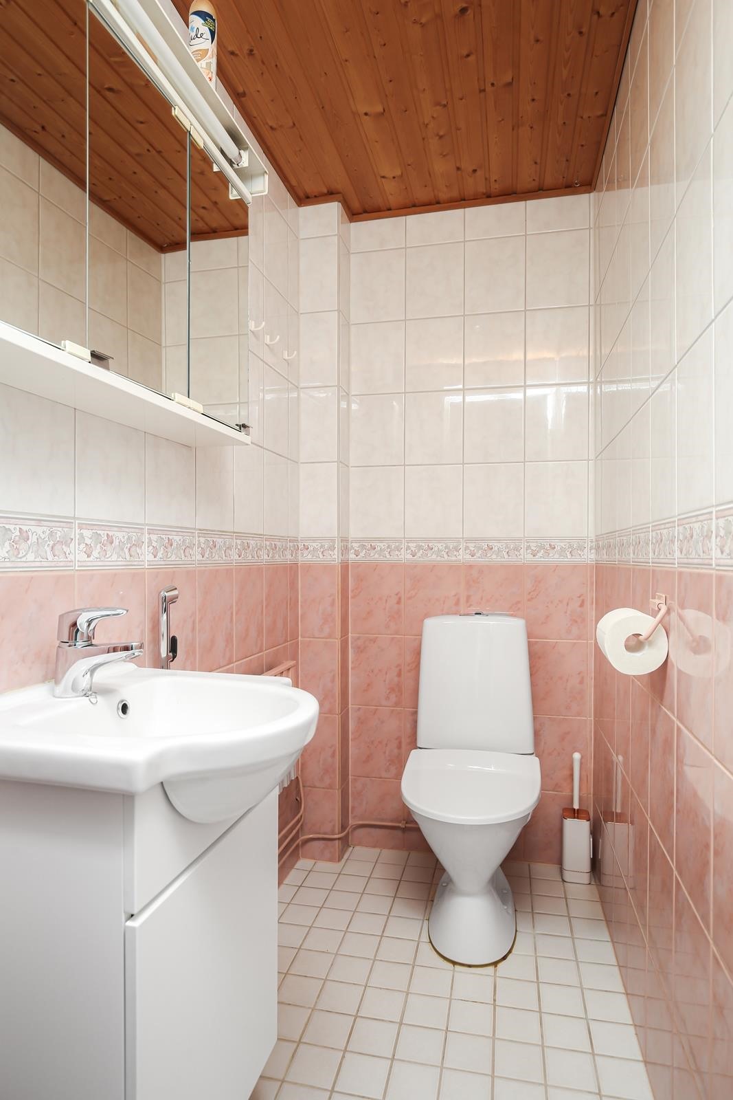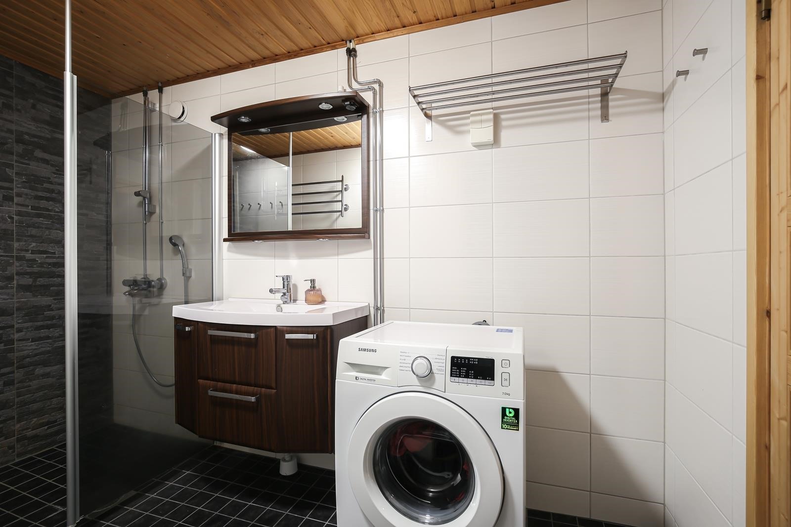 - Sauna, sähkökiuas, kylpyhuone, erillinen wc, suihku, amme, peilit kph, peilikaappi wc, allaskaappi, pesukoneliitäntä, kiinteät valaisimet. Kylpyhuone on remontoitu, tarkkaa vuotta ei tiedossa.