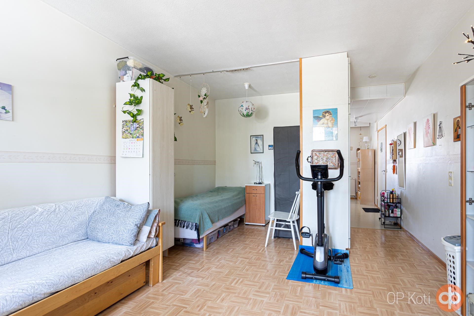 Keittiöön mahtuu ruokapöytä ja työskentelytilaakin on mukavasti. Olohuoneen jatkeena alkovi, jonka saa eristettyä omaksi tilaksi verholla tai vaikka kaapistolla. Kylpyhuoneen laatoitus on uusittu 90-luvulla ja omalle pyykkikoneelle on paikka.