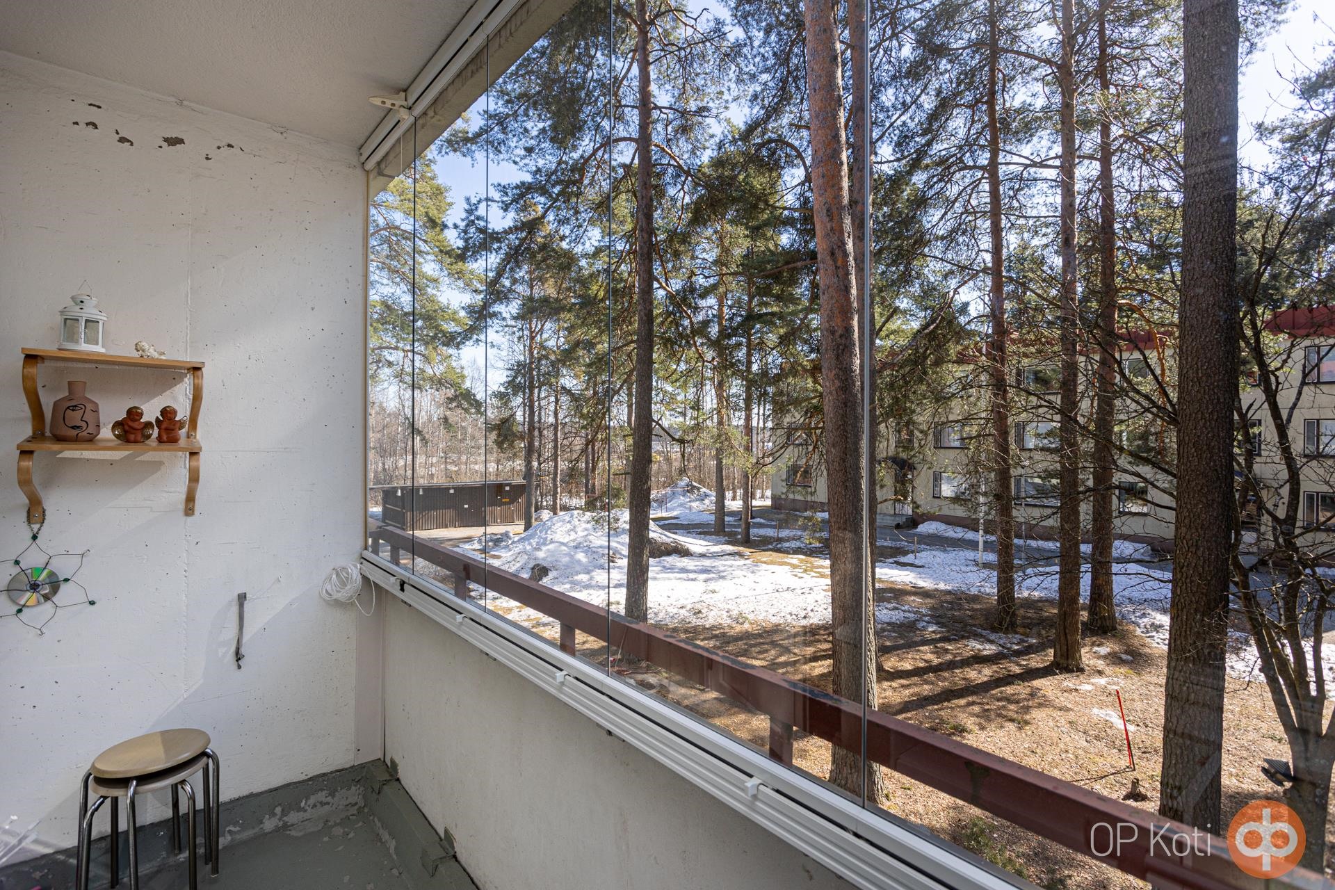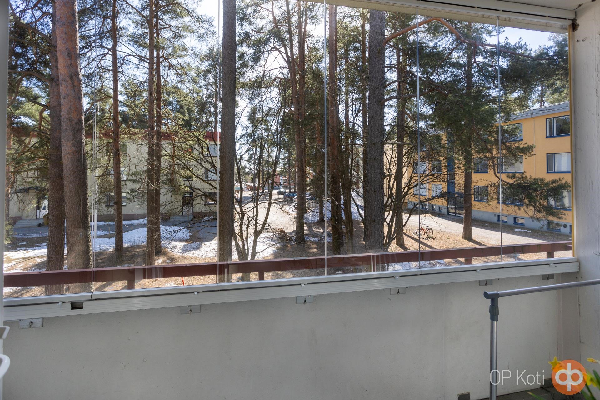 Läpitalon oleva siistikuntoinen yksiö, jossa olohuoneen jatkeena lasitettu parveke talojen välisen puistoalueen puolella etelän suuntaisesti.