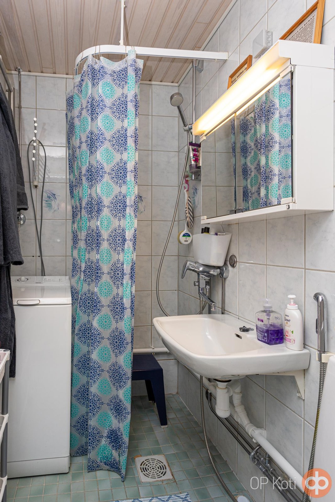 - Kylpyhuone, suihku, peilikaappi, pesukoneliitäntä, kiinteät valaisimet.
