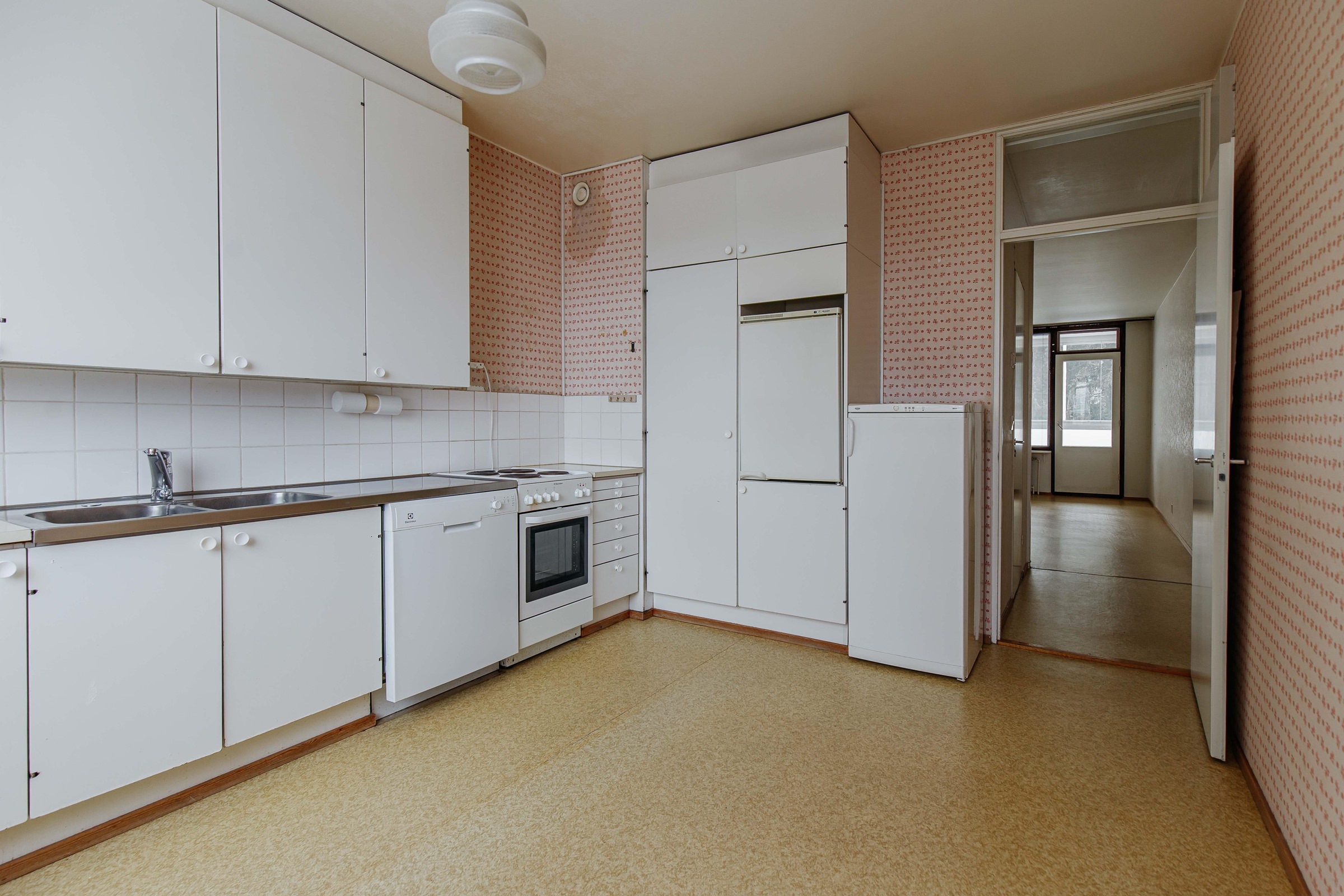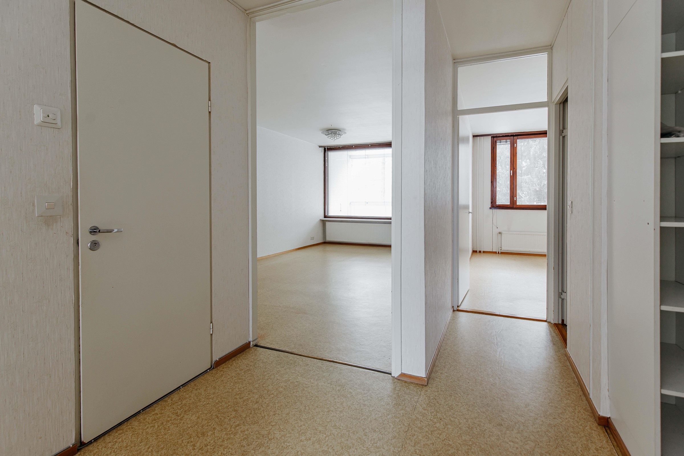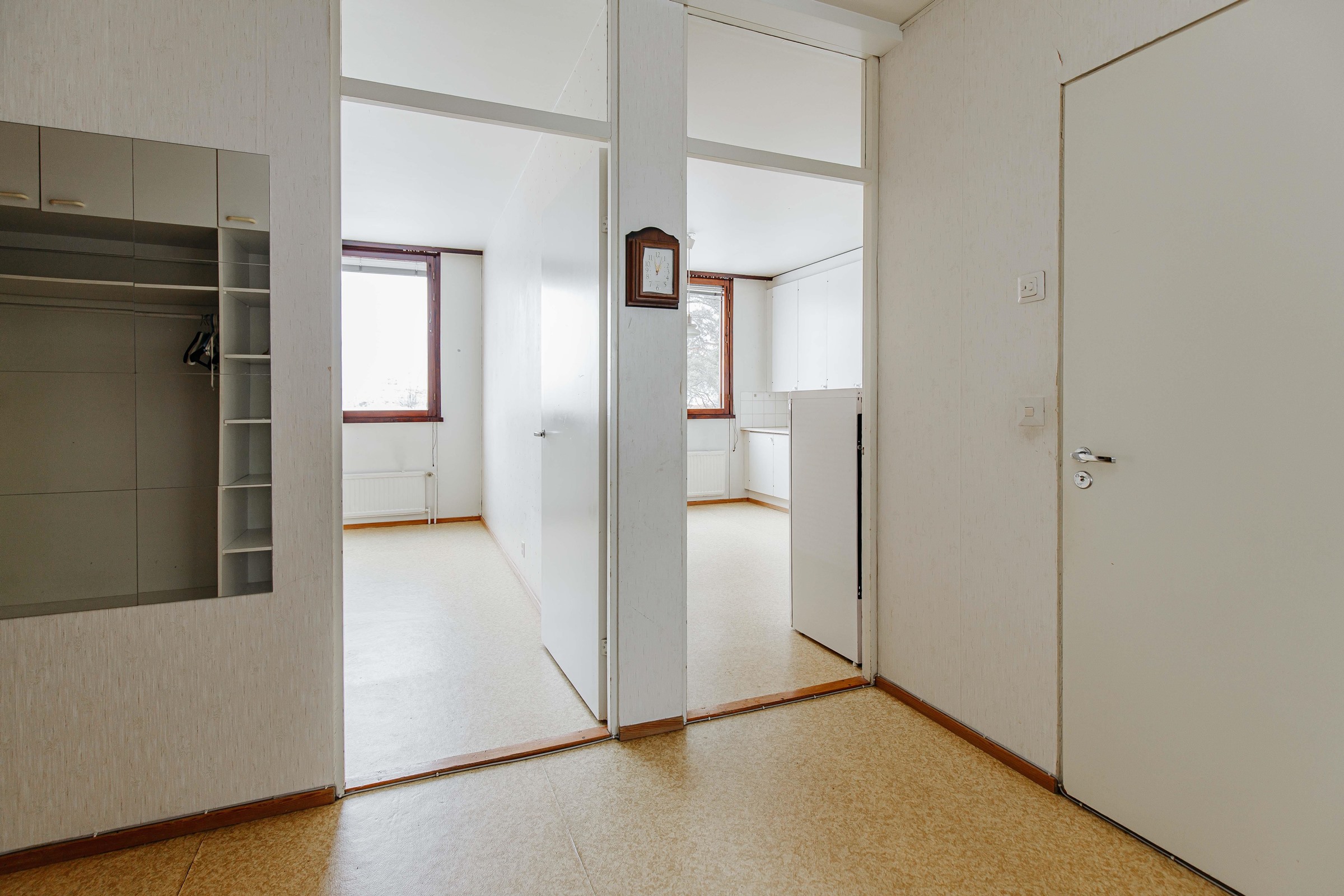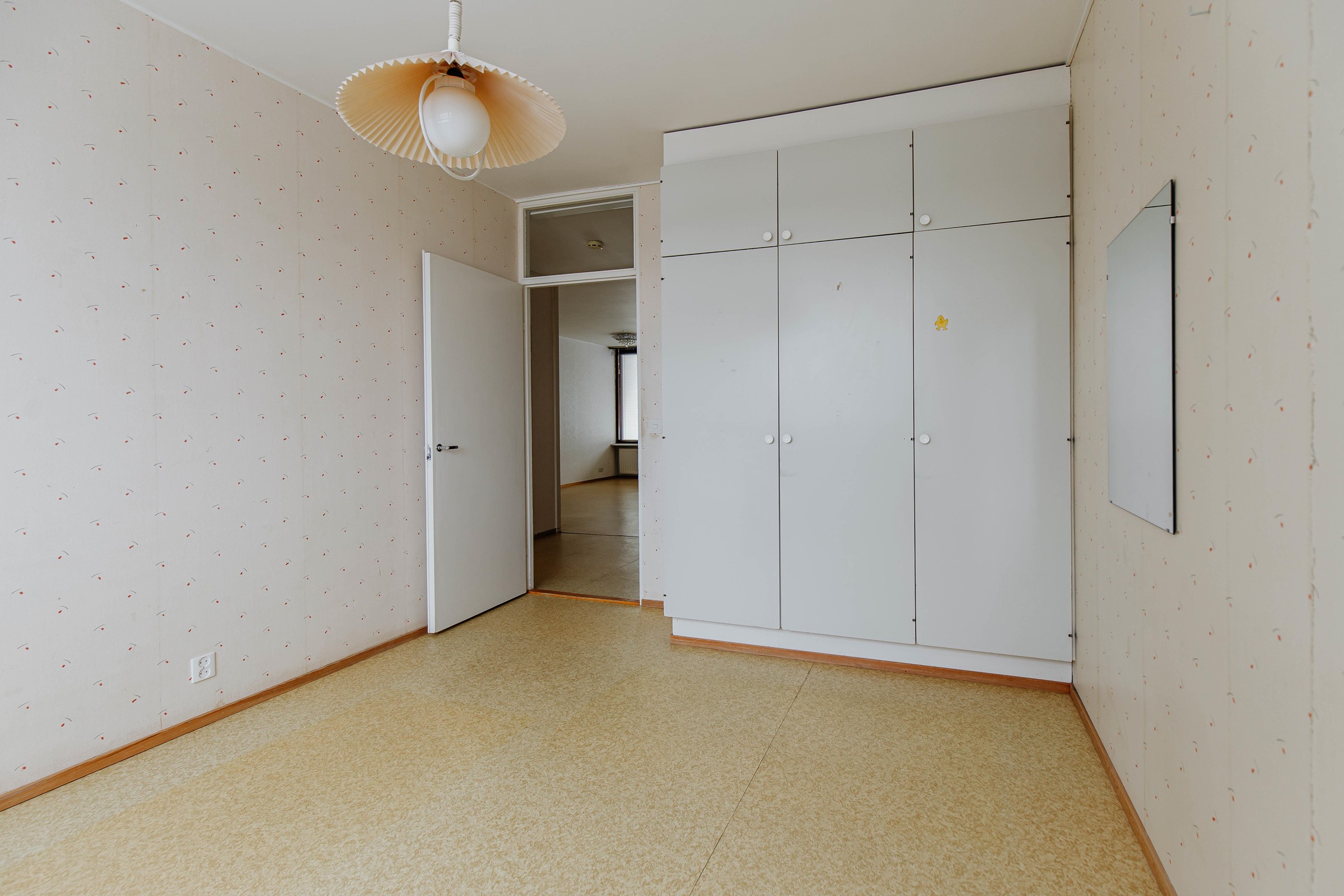 Tämä 76,5 m² kolmio on pinnoiltaan suurilta osin alkuperäinen, mutta kylpyhuone on uusittu vesieristeineen arviolta 2010-luvun alussa. Asunto koostuu tilavasta keittiöstä, kahdesta makuuhuoneesta, kylpyhuoneesta sekä avarasta olohuoneesta, josta käynti lasitetulle parvekkeelle, joka toimii lisähuoneena aikaisesta keväästä pitkälle syksyyn.