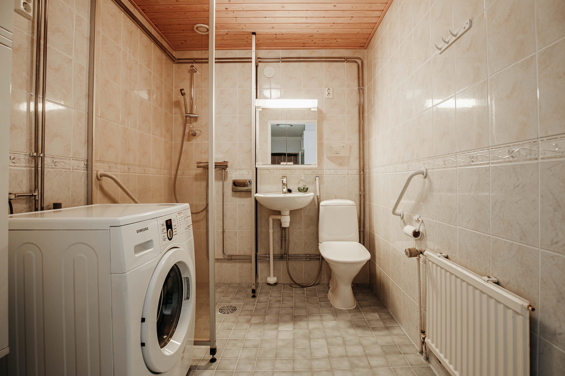 - Kylpyhuone, suihku, suihkuseinä, peilit, peilikaappi, kaapit, pesukoneliitäntä, lattialämmitys, kiinteät valaisimet.