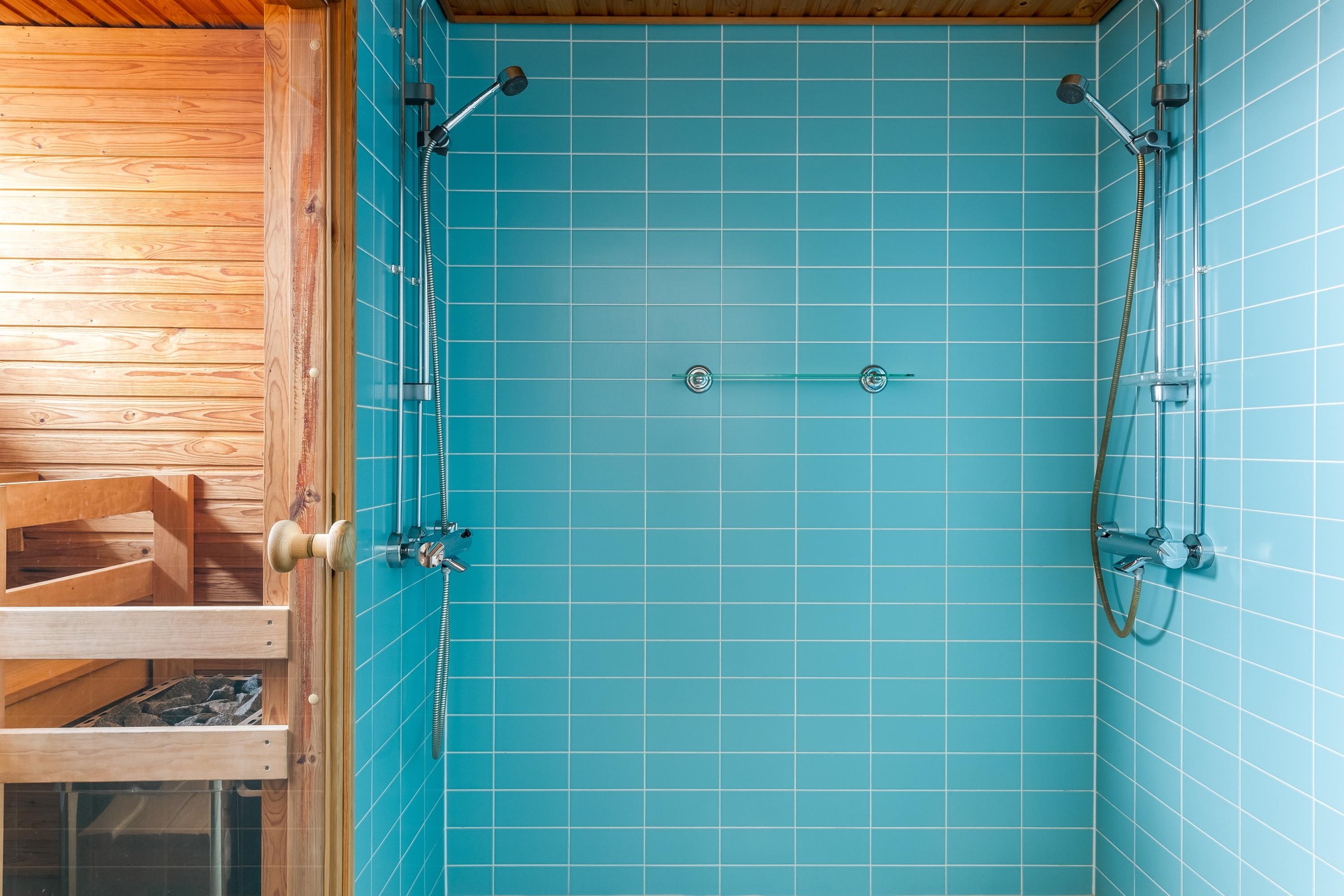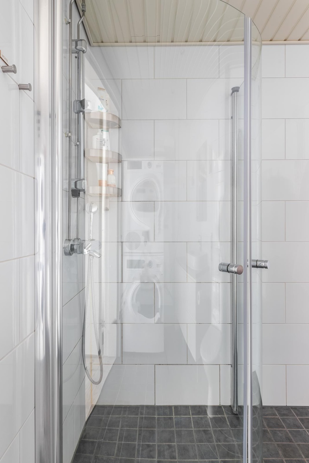 - Kylpyhuone, suihku, suihkuseinä, peilit 1 kpl, allaskaappi, pesukoneliitäntä, lattialämmitys, kiinteät valaisimet.