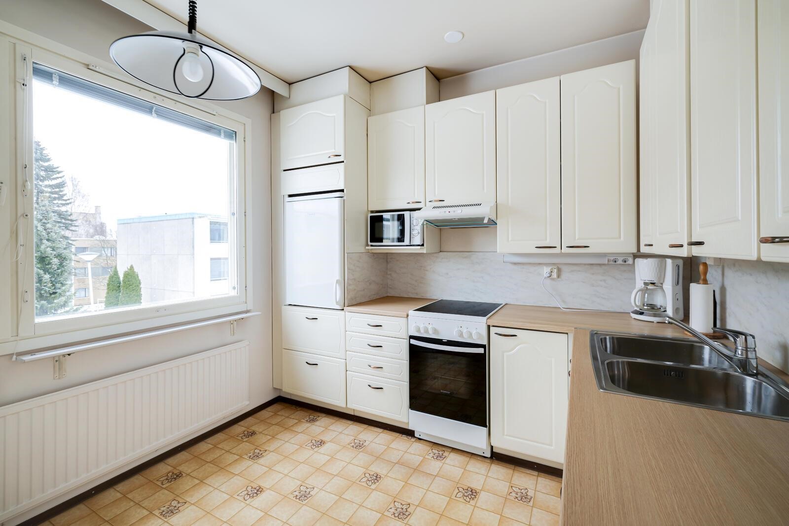 - Jääkaappi, pakastekaappi, keraaminen liesi, liesituuletin v. 2016, mikroaaltouuni, kaapistot, kiinteät valaisimet, työtaso v. 2018. Keittiö uusittu v. 2013.