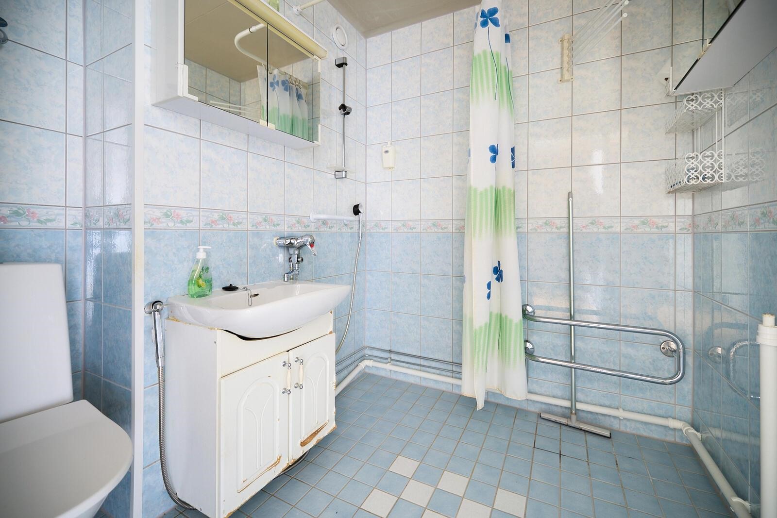 - Kylpyhuone, suihku, peilit, peilikaappi x2, pesukoneliitäntä, kiinteät valaisimet, vesikiertoinen pyyhekuivain, tukikahvat. Kylpyhuone uusittu v. 2009-2010.