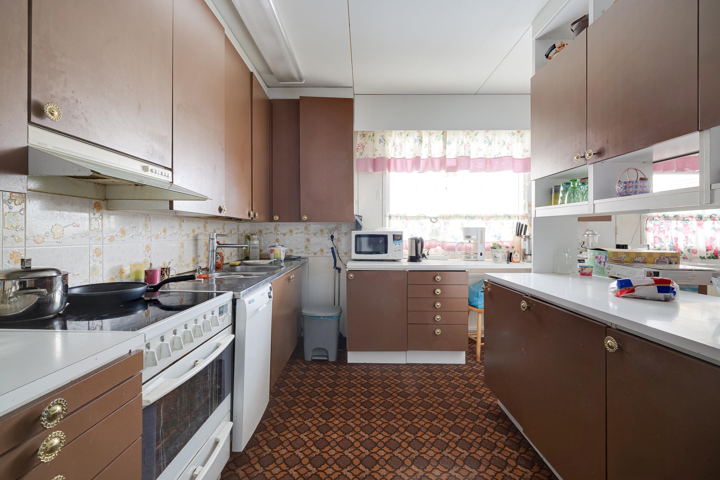 - Jääkaappi, pakastekaappi, lattialiesi, keraaminen liesi, liesituuletin, leivinuuni, astianpesukone, kaapistot, kiinteät valaisimet, pöytätasojen materiaali Ikilaminaattilevy.