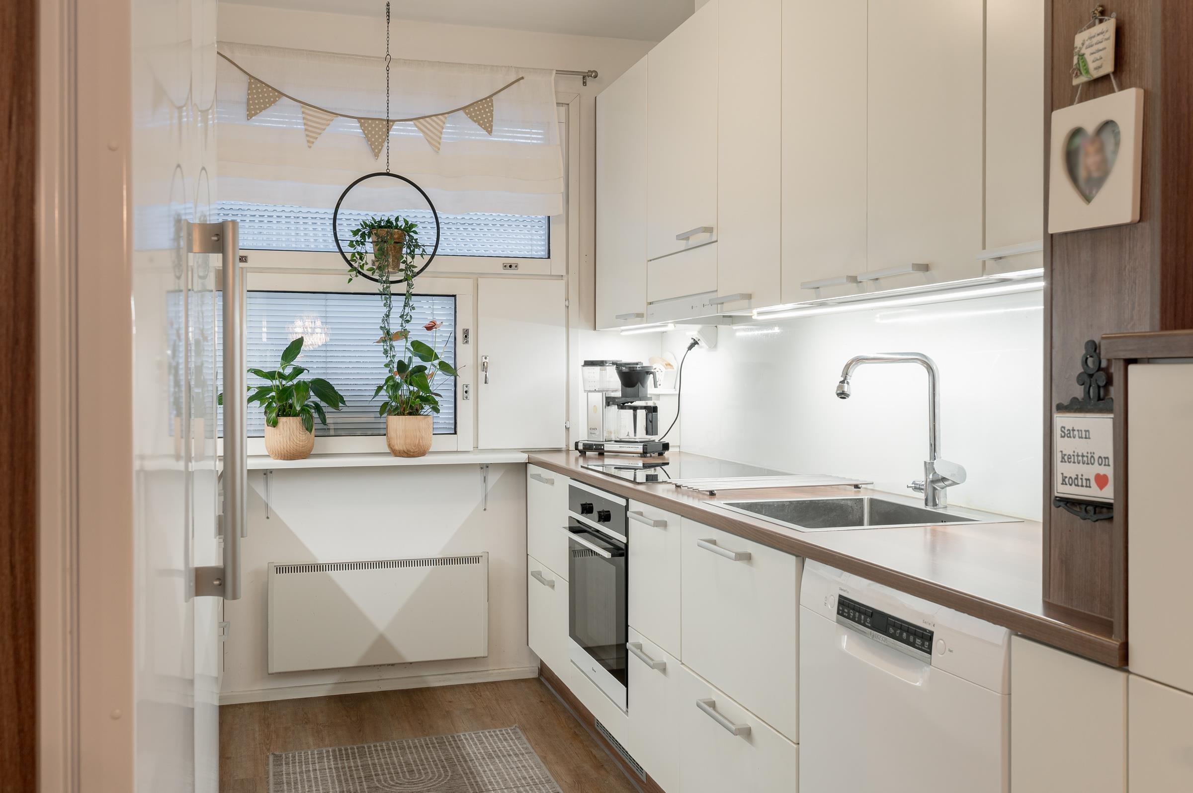 - Jääkaappipakastin, liesituuletin, astianpesukone, kaapistot, kiinteät valaisimet.