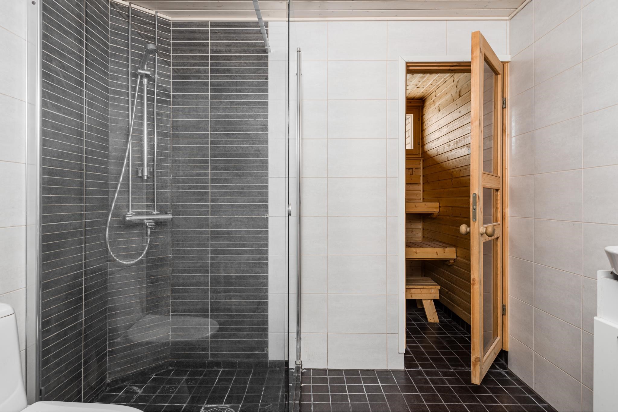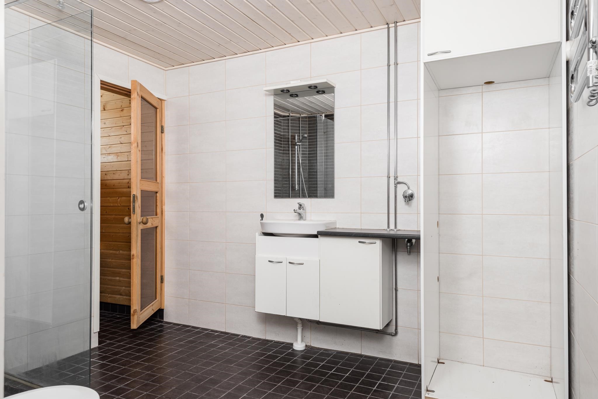 - Sauna, sähkökiuas, kylpyhuone, erillinen wc, suihku, suihkuseinä, peilit, peilikaappi, allaskaappi, pesukoneliitäntä, lattialämmitys Pesuhuoneessa, kiinteät valaisimet.