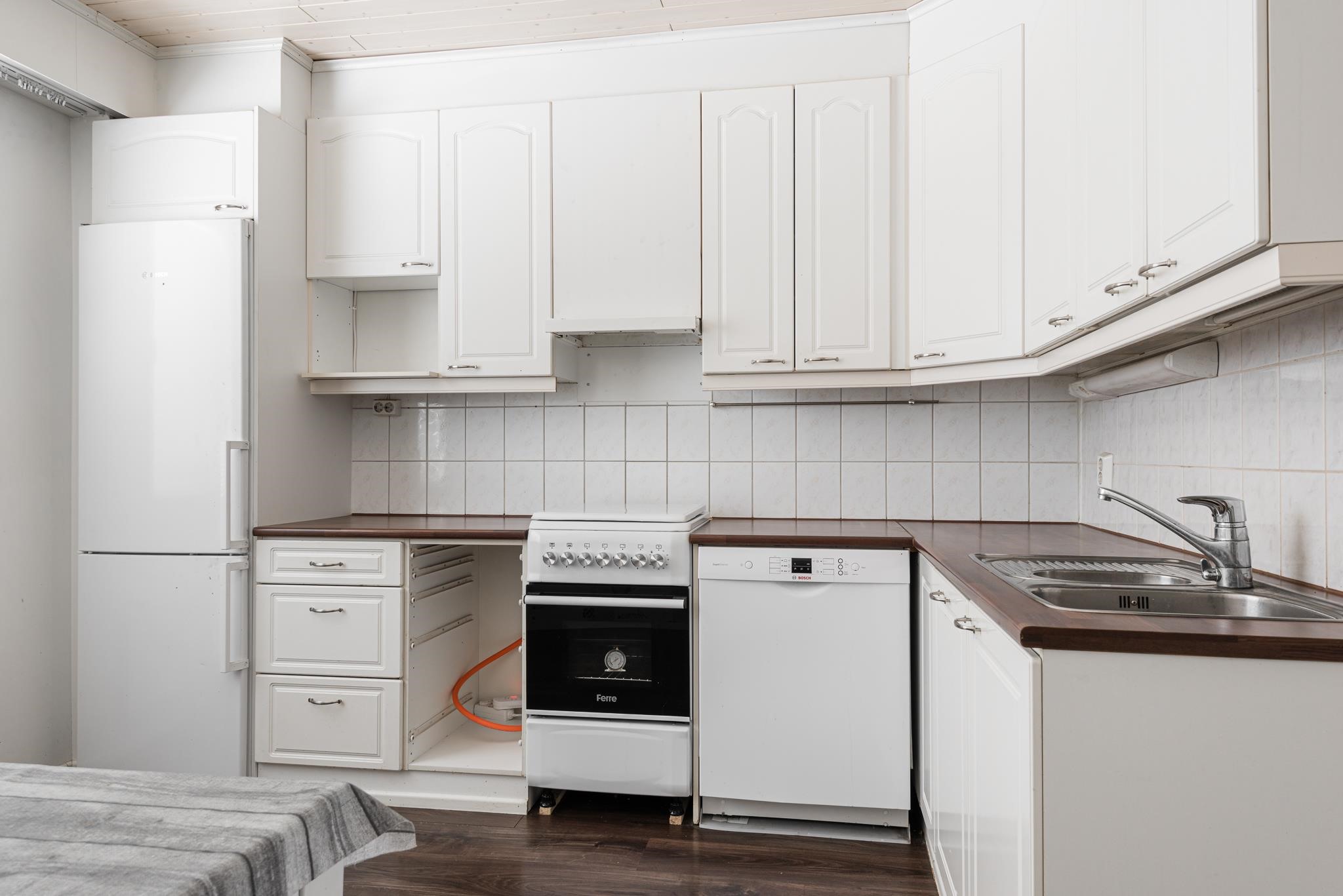 - Jääkaappipakastin, keraaminen liesi, kaasuliesi.
