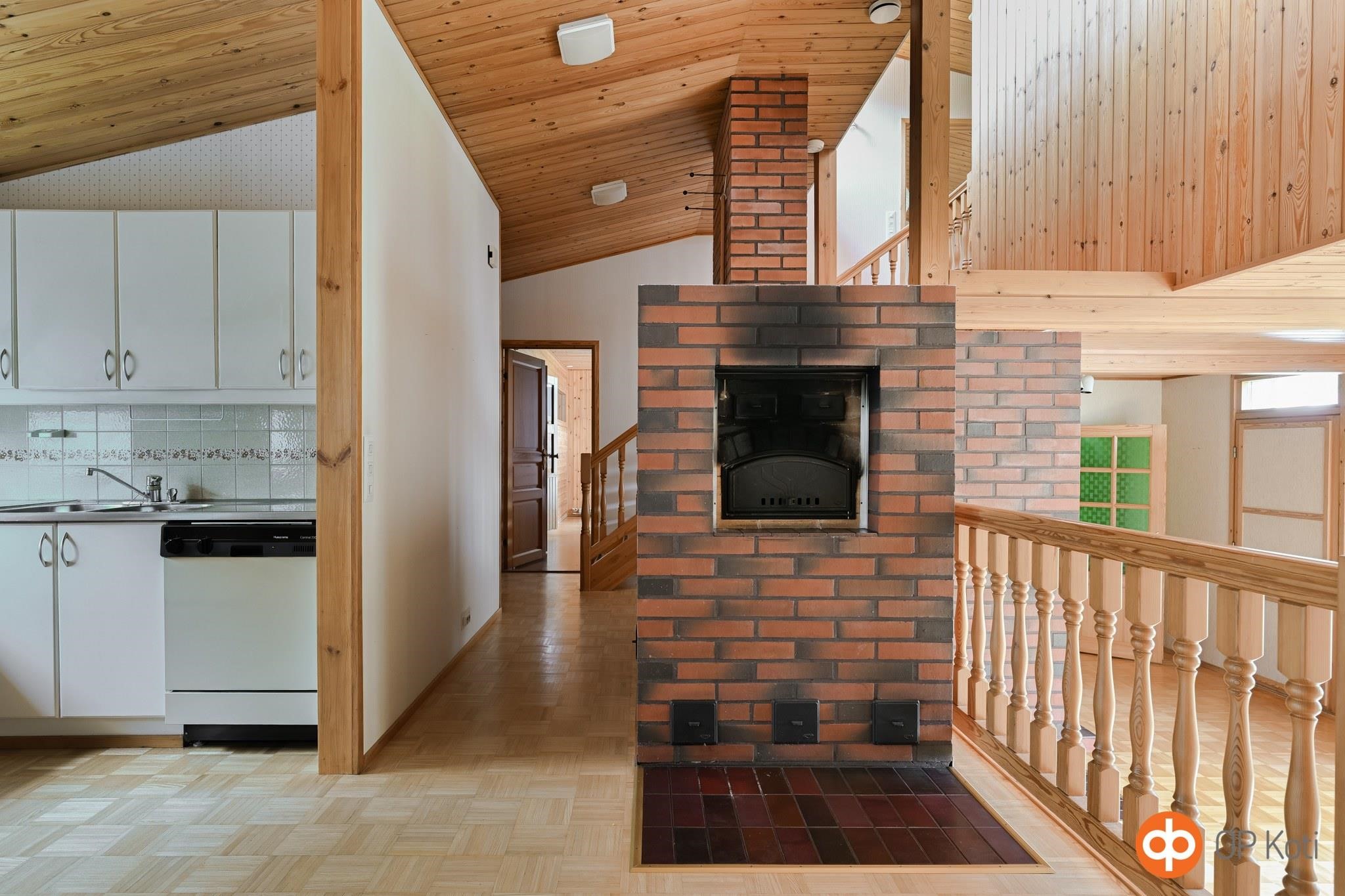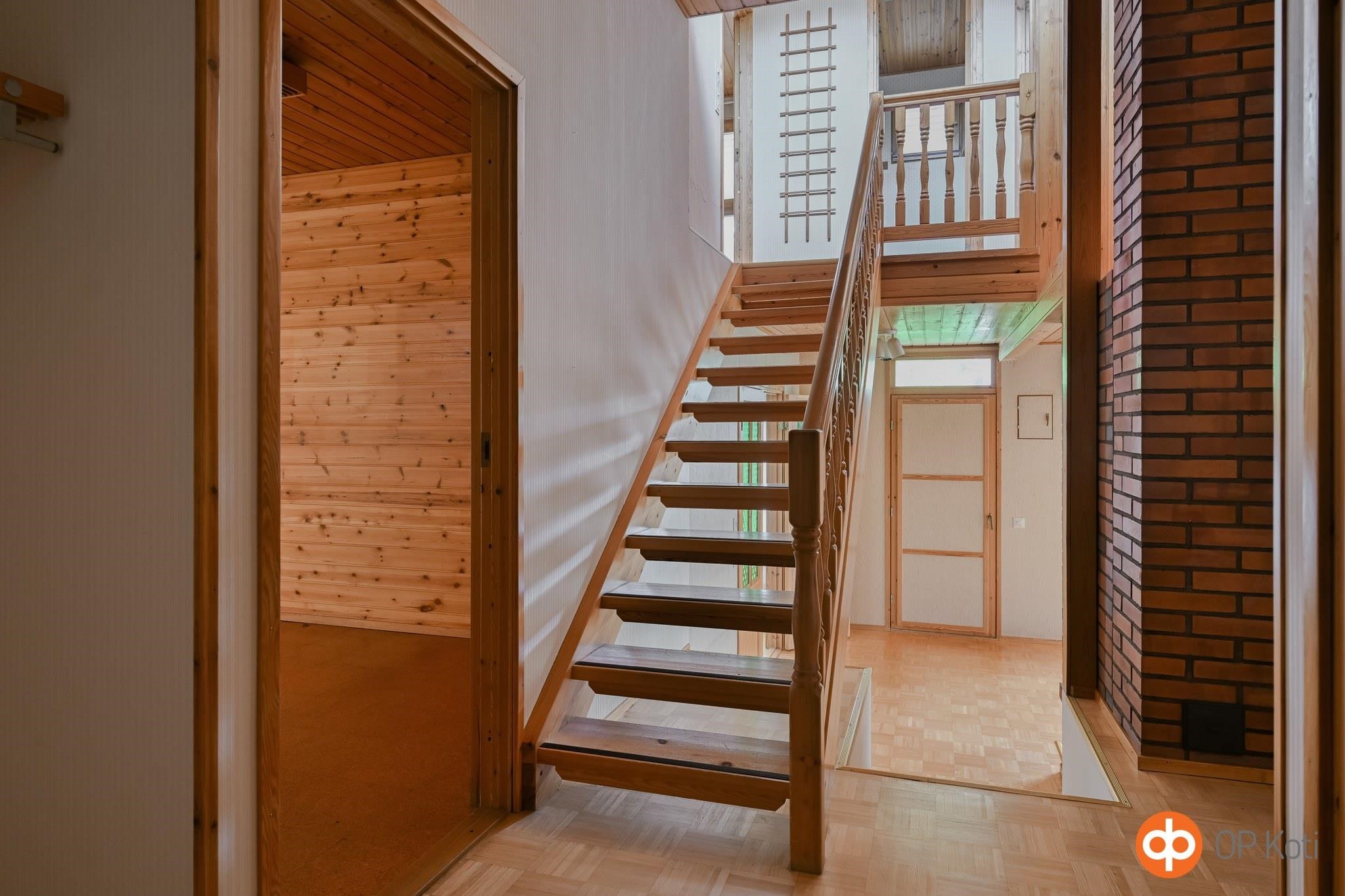 Keittiö: maalatut/tapetoidut seinät, lattiassa mosaiikkiparketti.. Olohuone: maalatut/tapetoidut seinät, lattiassa mosaiikkiparketti.. Makuuhuone 1: maalatut/tapetoidut seinät, lattiassa mosaiikkiparketti.. Makuuhuone 2: paneloidut seinät, lattiassa korkkijäljitelmä. Sauna: paneloidut seinät, laattalattia. Kylpyhuone: laatoitetut seinät, laattalattia.. Yläkerran makuuhuoneet (2 kpl):: maalatut/tapetoidut seinät, lautalattia..
