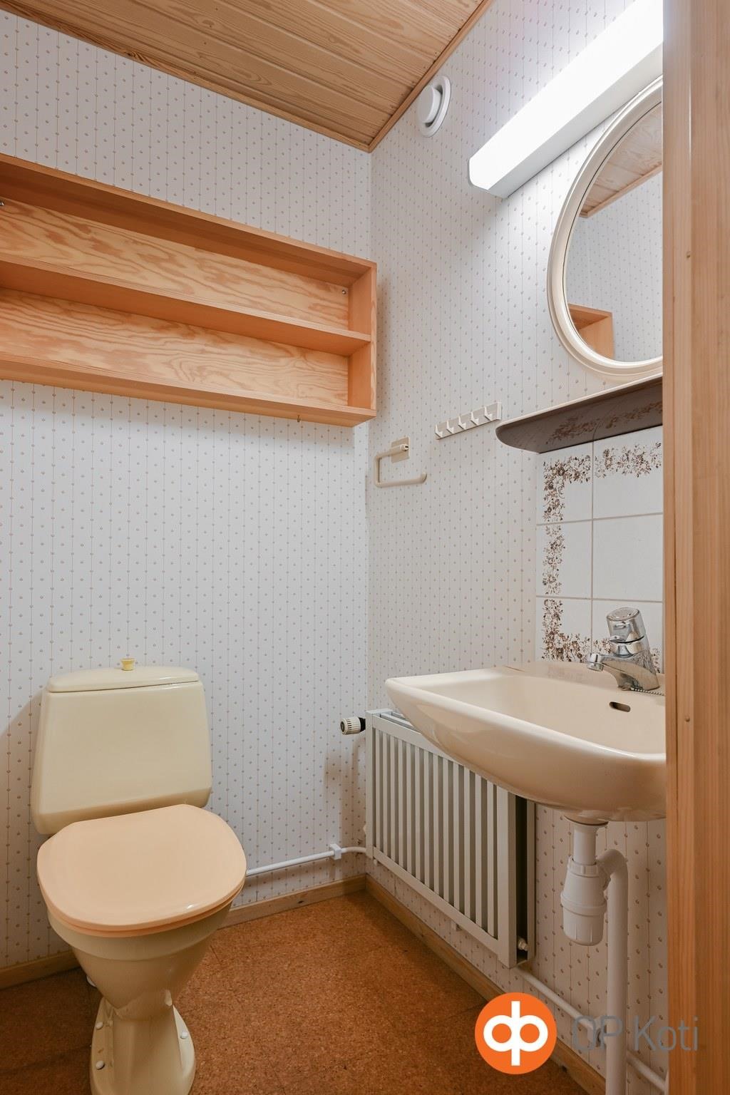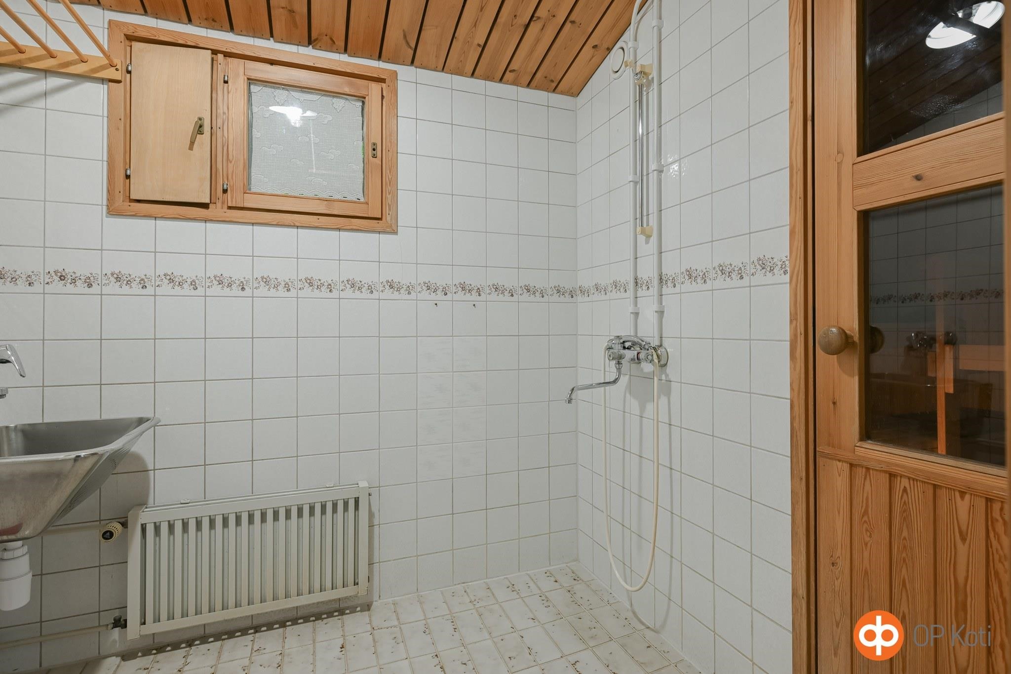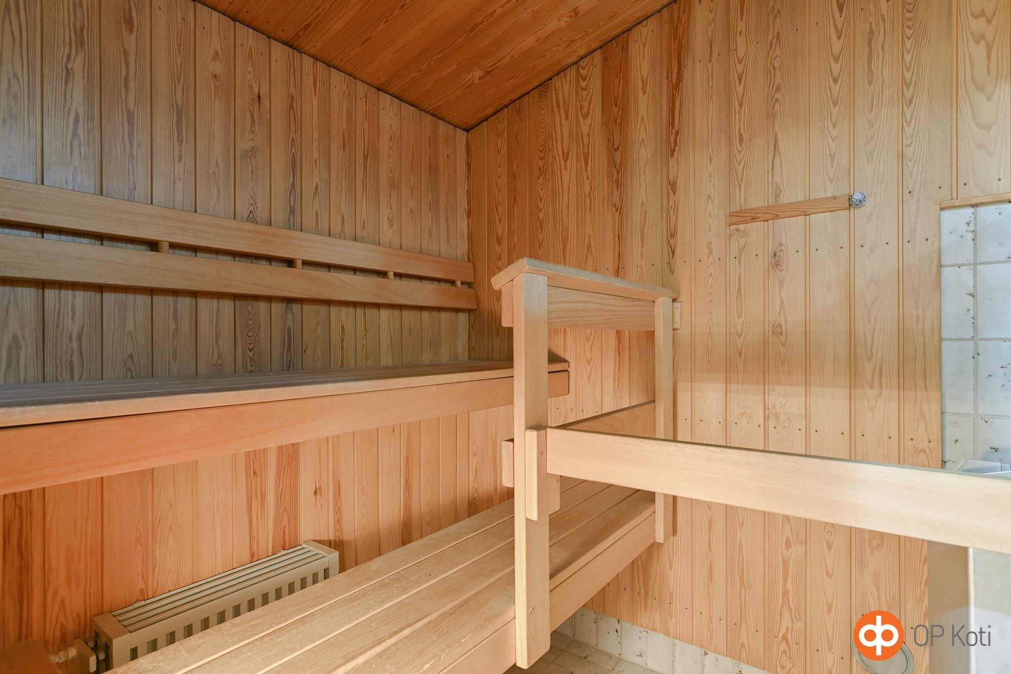 - Sauna, sähkökiuas, kylpyhuone, erillinen wc, suihku, peilit, allaskaappi, pesukoneliitäntä, kiinteät valaisimet.