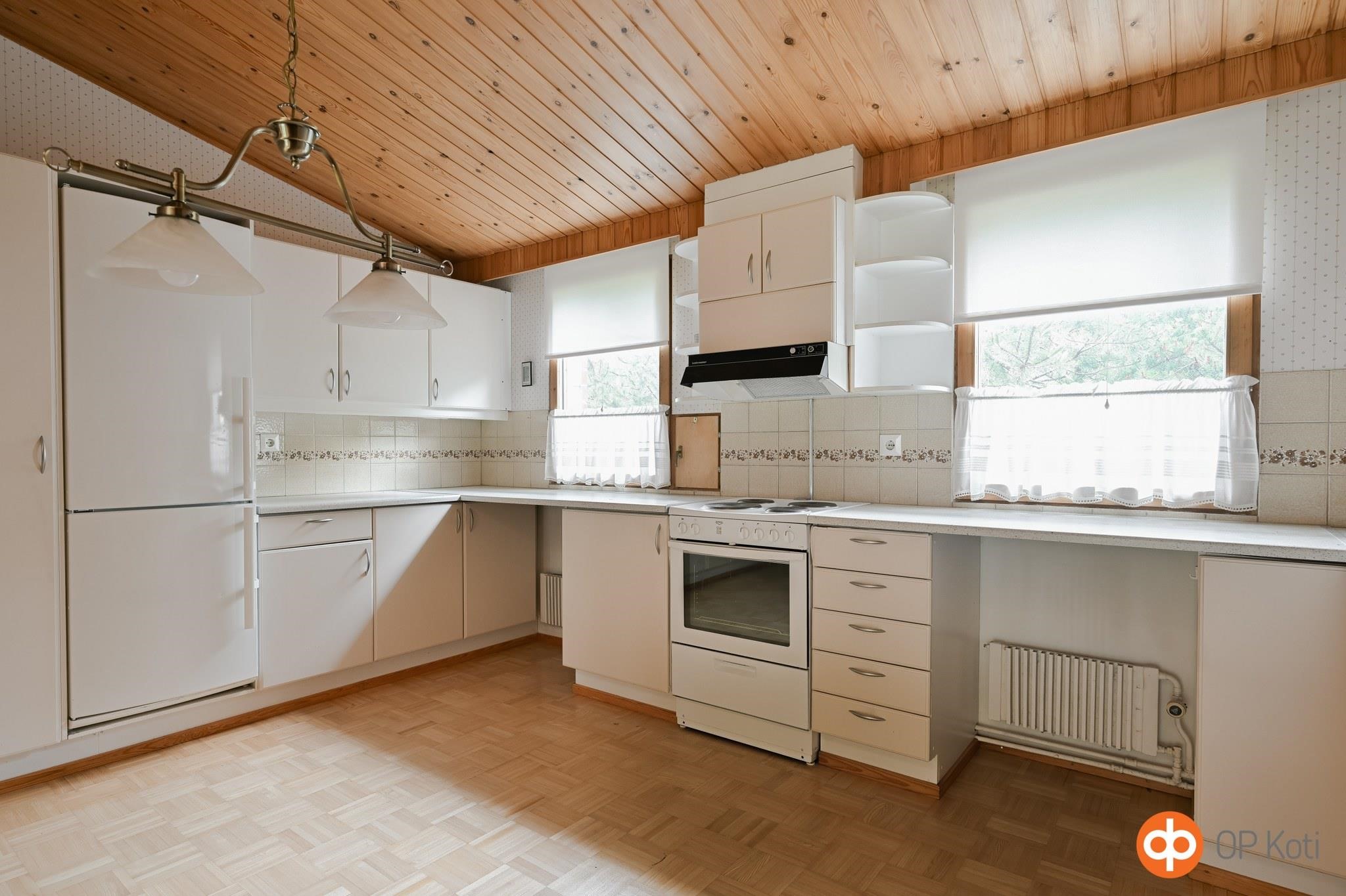 - Jääkaappipakastin, liesitaso, sähköliesi, liesituuletin, leivinuuni, astianpesukone, kaapistot, kiinteät valaisimet, pöytätasojen materiaali Laminaattitasot.