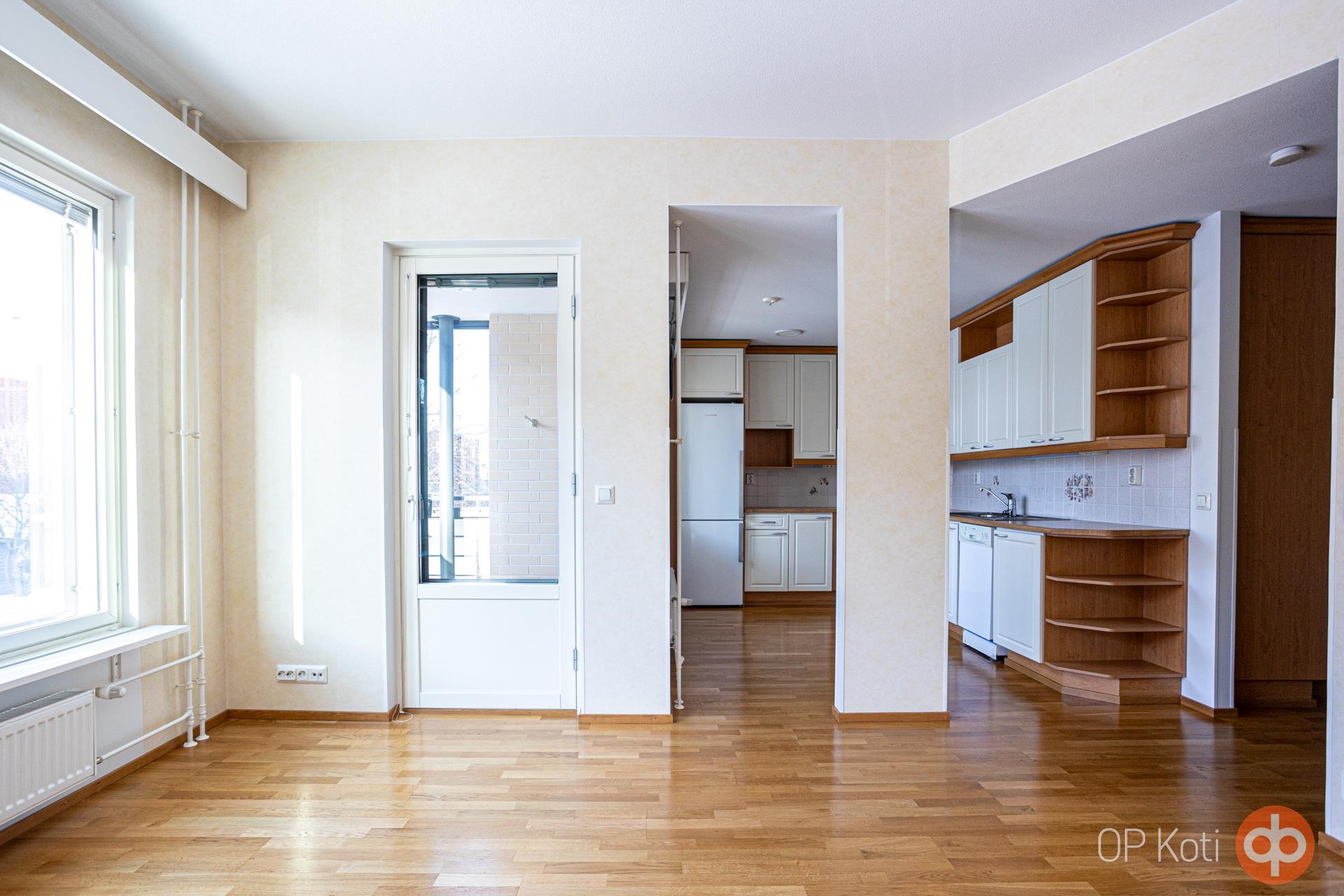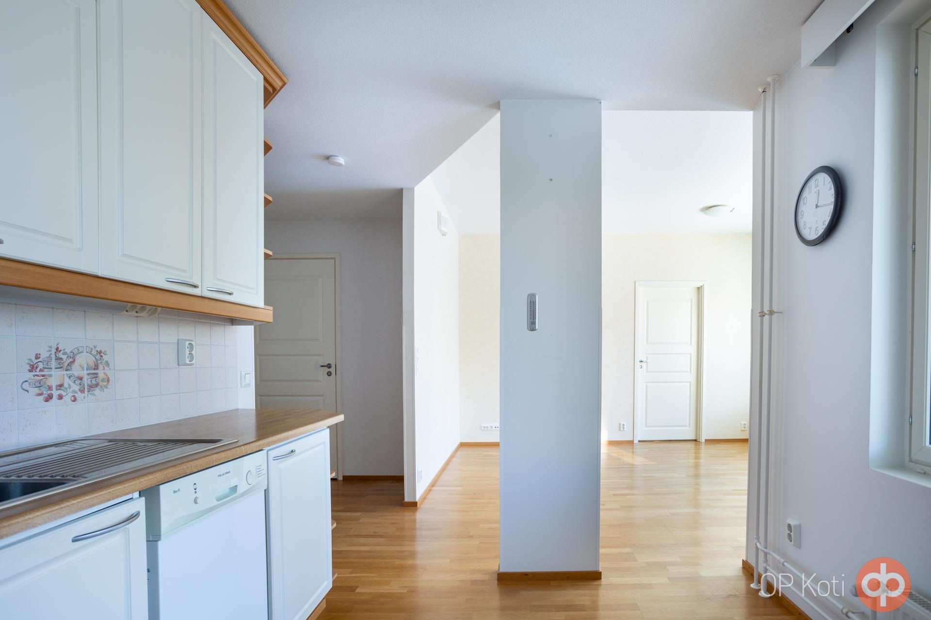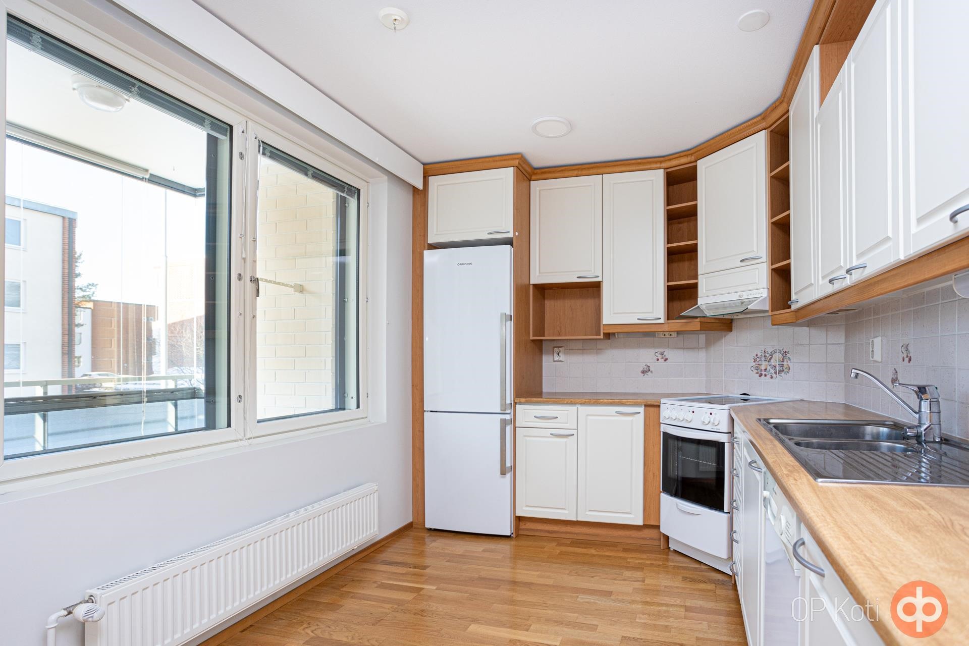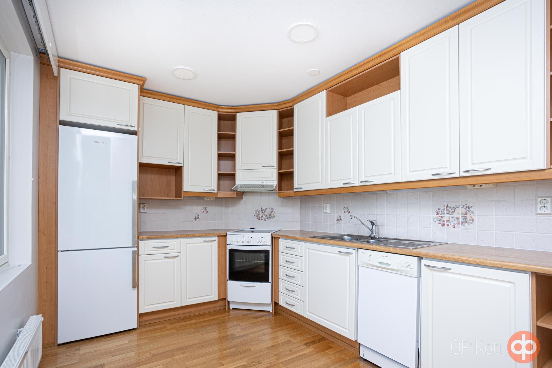 Keittiössä on runsaasti työtasoja ja kaappitilaa. Keittiö yhdistyy olohuoneeseen avarasti ilman turhia väliseiniä ja ovia. Suuret ikkunat päästävät luonnonvalon tulvimaan sisään. Tammiparketti tuo lämpöä ja kauneutta kotiisi.