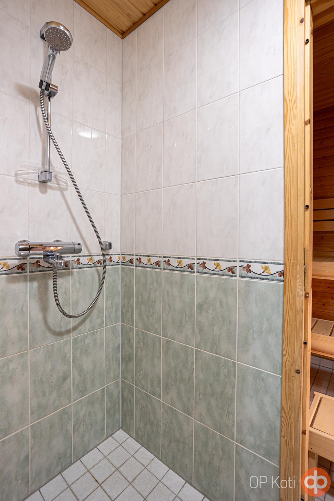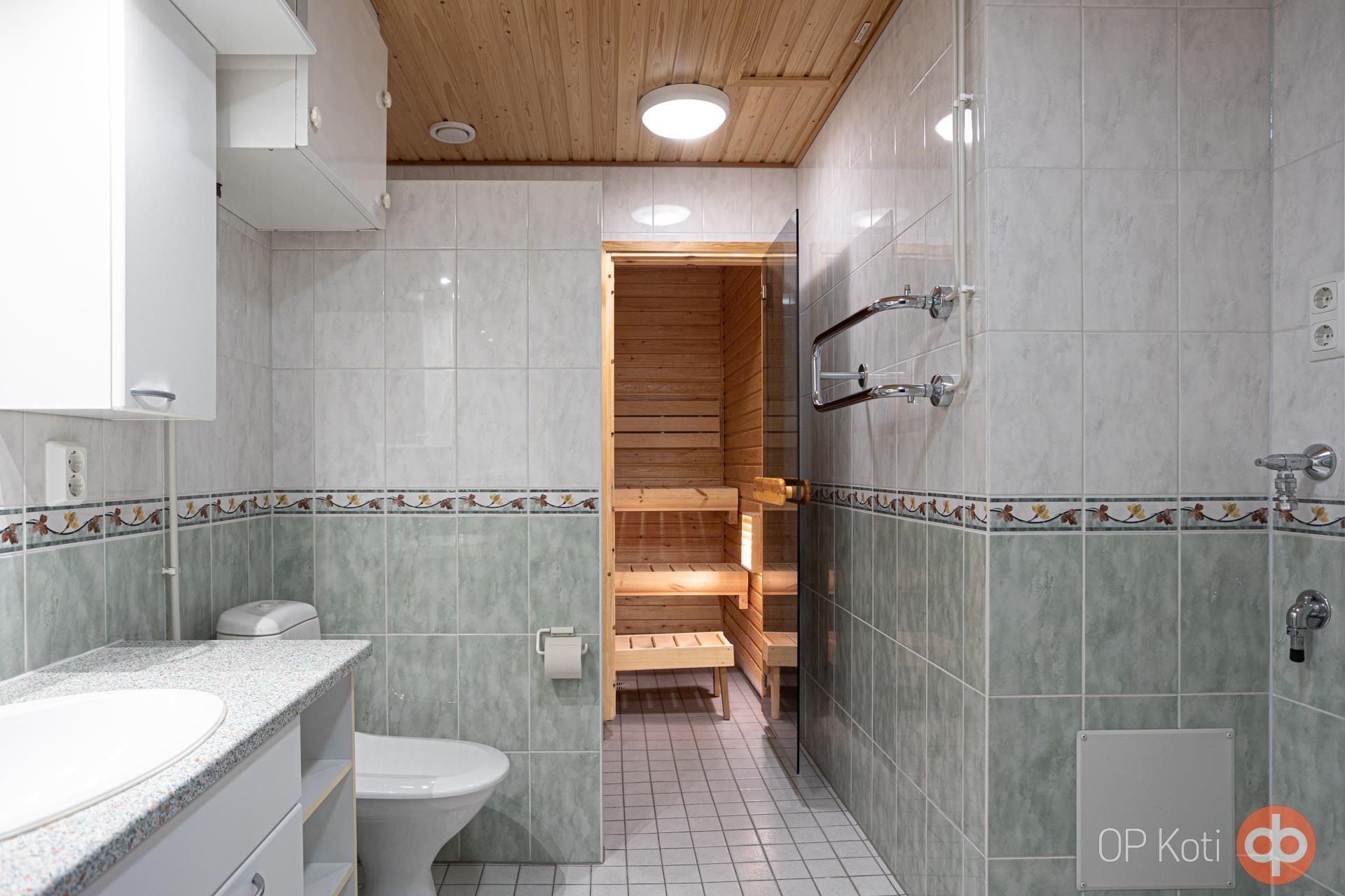 - Sauna, sähkökiuas, kylpyhuone, suihku, suihkuseinä, peilikaappi, allaskaappi, pesukoneliitäntä, lattialämmitys, kiinteät valaisimet.