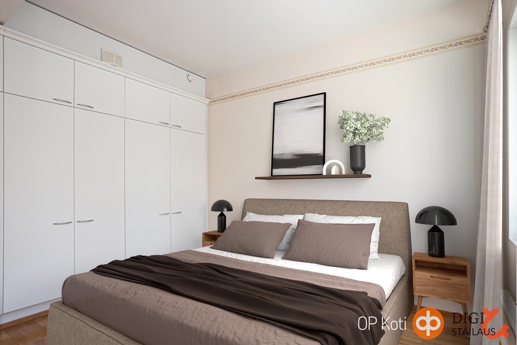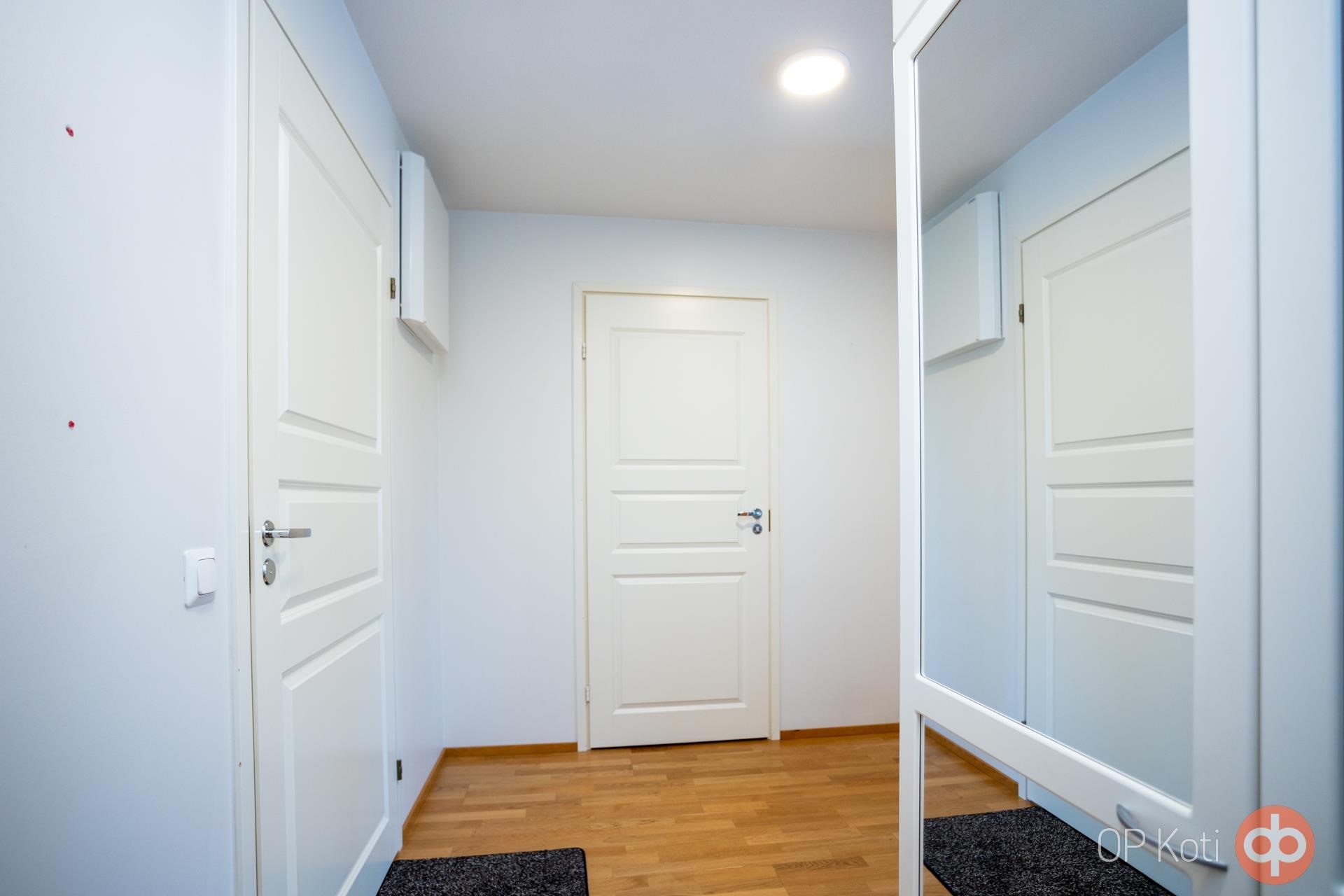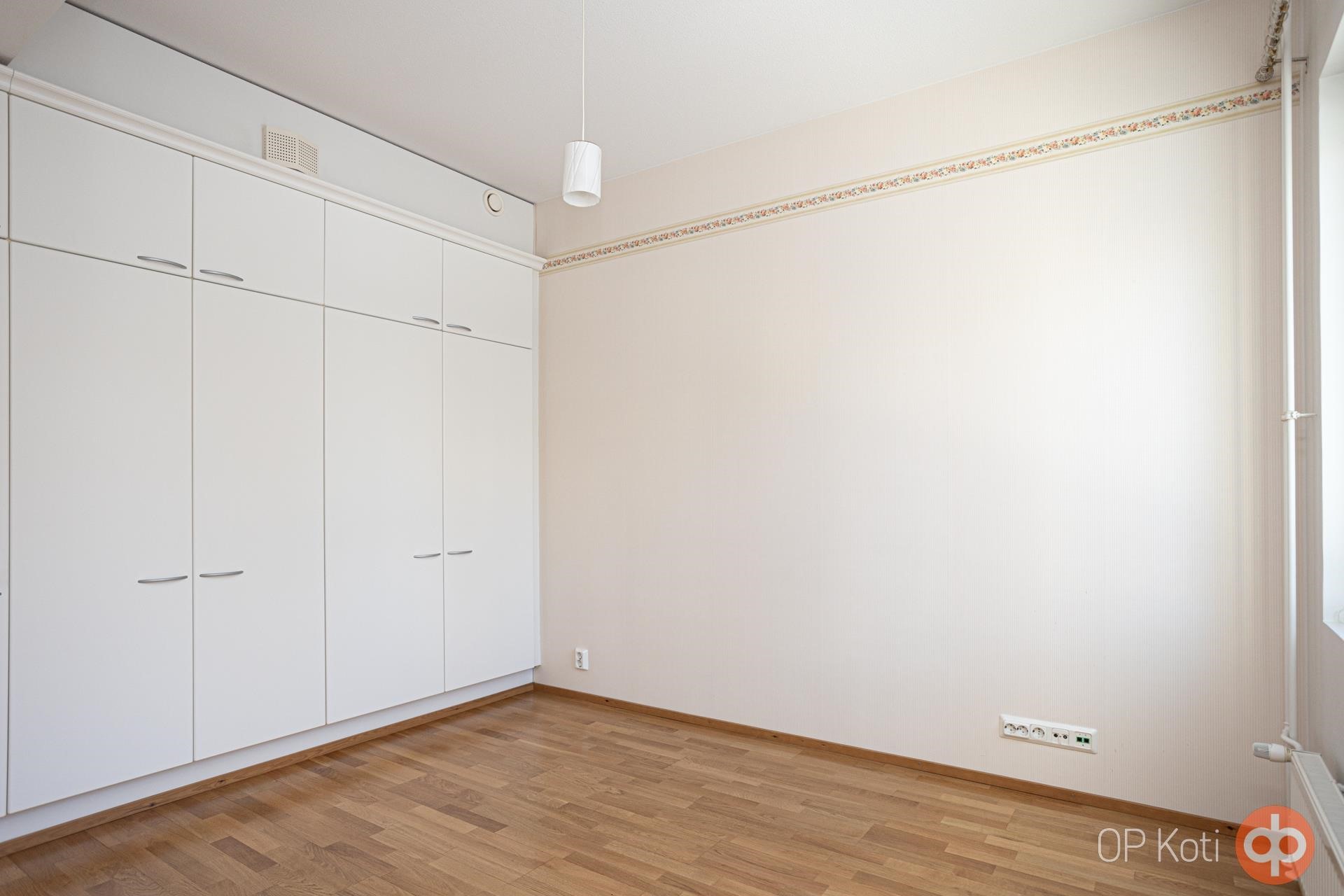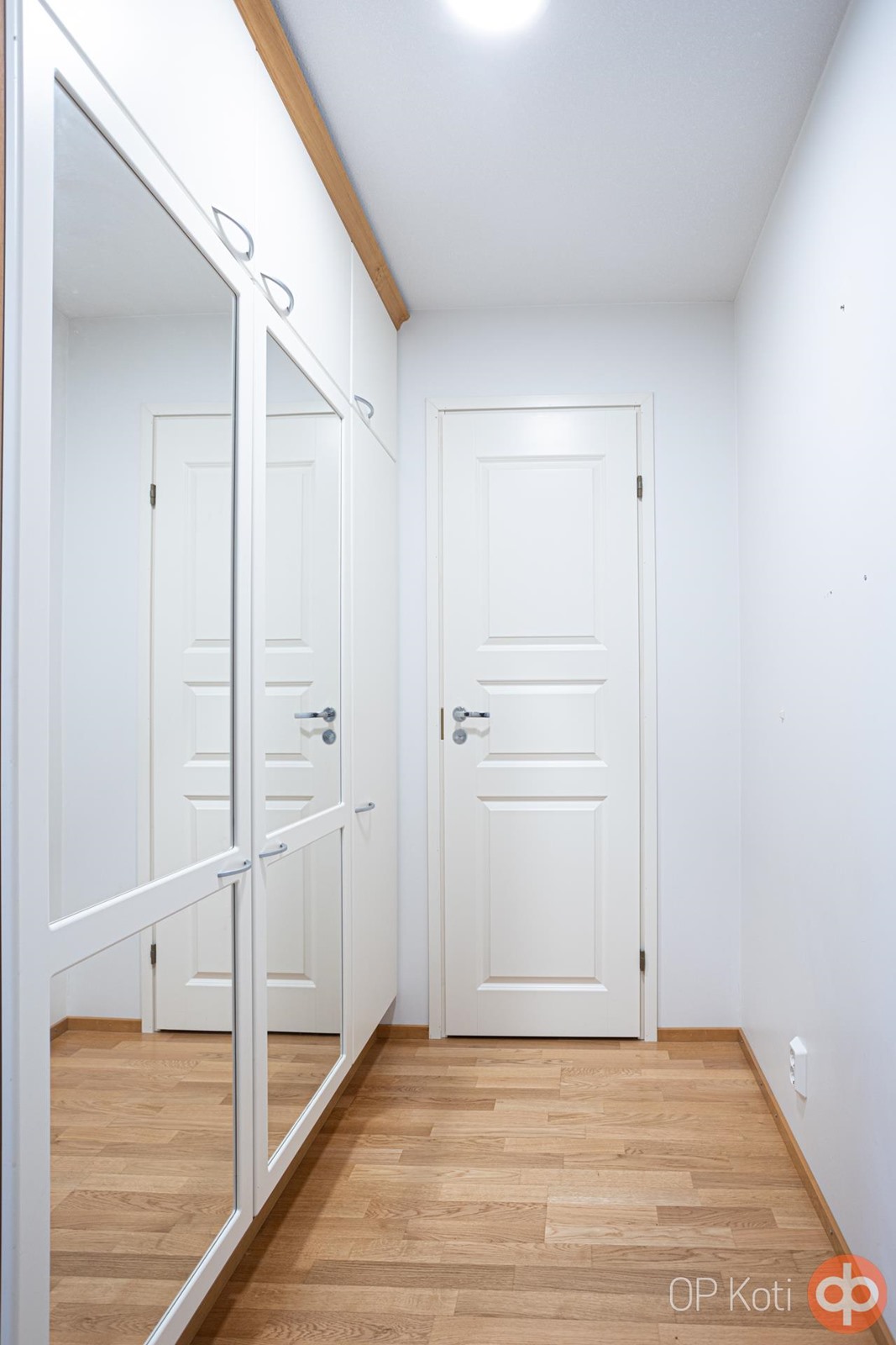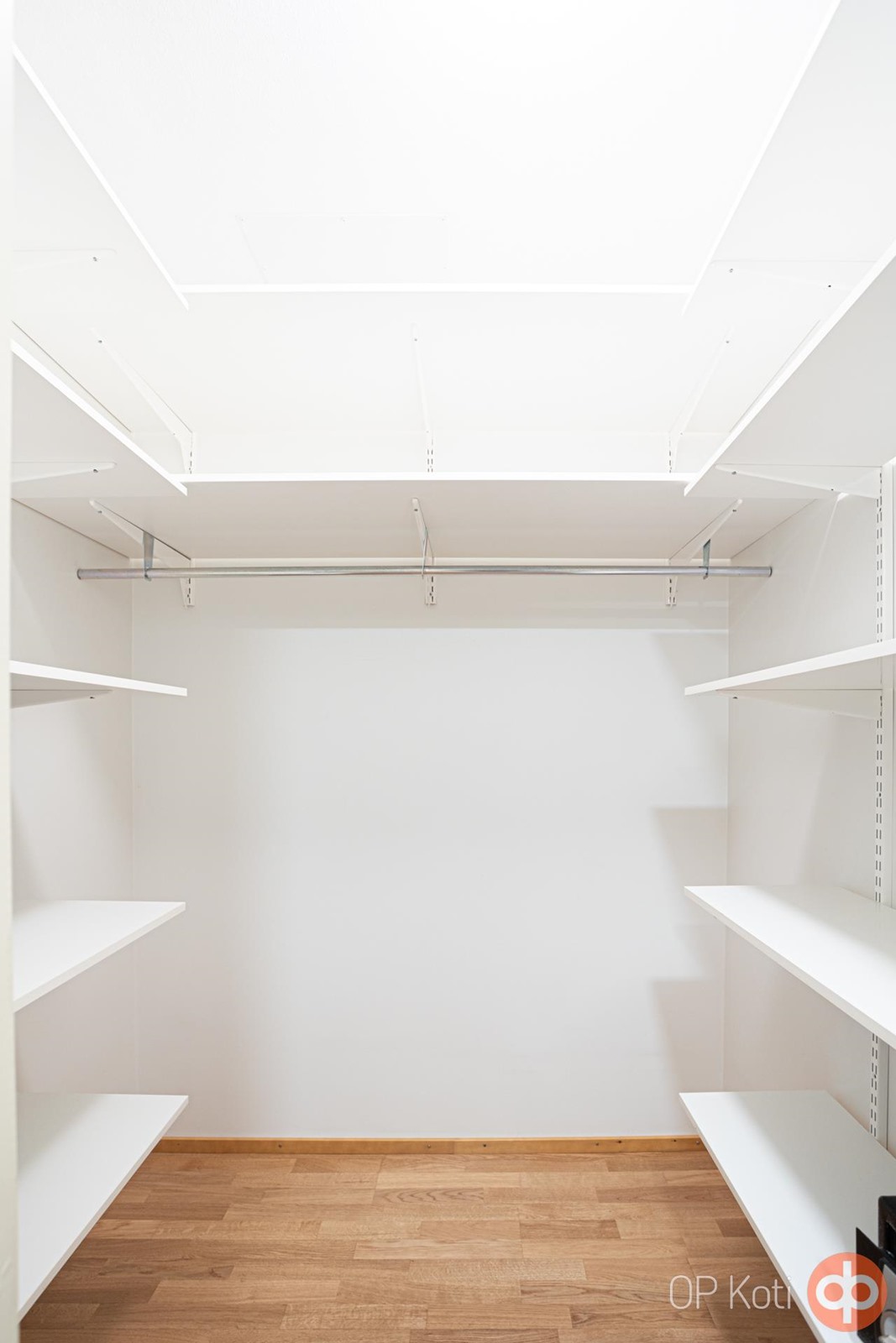 Makuuhuoneen kaapistojen lisäksi säilytystilaa löytyy erillisestä vaatehuoneesta ja eteisen kaapistosta.