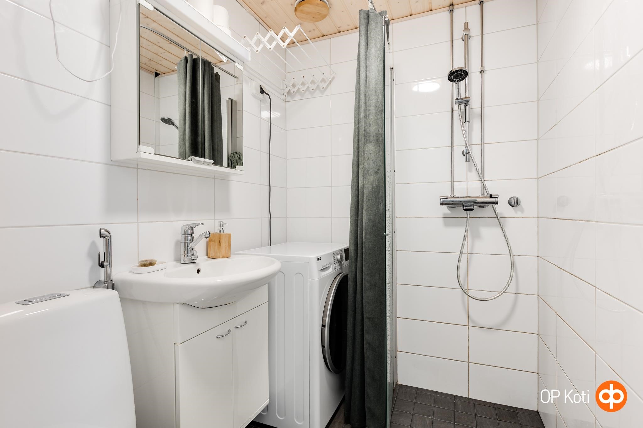 - Kylpyhuone, erillinen wc, suihku, suihkuseinä, allaskaappi allaskaappi puusepäntyötä, pesukoneliitäntä, lattialämmitys kph:ssa, kiinteät valaisimet.