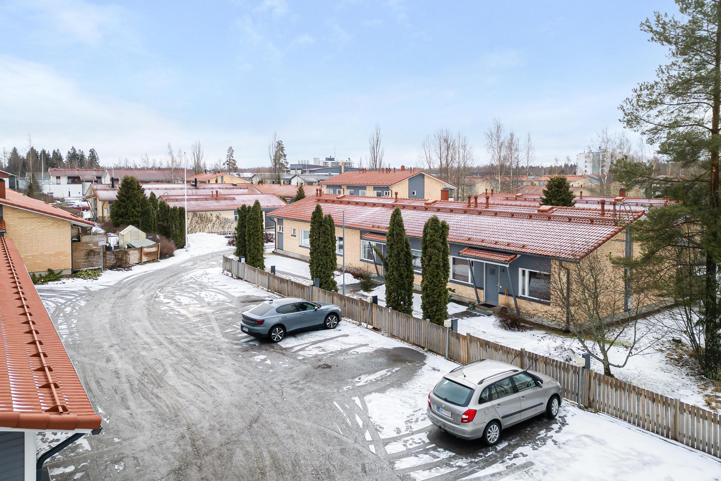 Tapainlinnan pientaloalueella hyväkuntoinen rivitalokoti. Hyvin suunnitellut tilaratkaisut. Yhtenäinen olohuone ja keittiön ruokailutila tuovat huoneistoon avaruutta. Olohuoneessa varaava, Kermansaven tyylikäs takka. Reilusti säilytystilaa mm. vaatehuone, huoneistokohtainen lämmin ja kylmä varasto. Koneellinen tulo- ja poistoilmanvaihto. Lämmityksen tukena varaava takka sekä ilmalämpöpumppu. Huoneistolle kuuluu yksi autopaikka ja lisäksi on mahdollisuus ostaa autokatososake, jonka yhteydessä on myös varasto. Vaihdossa huomioidaan kerrostalokolmio hissitalosta
