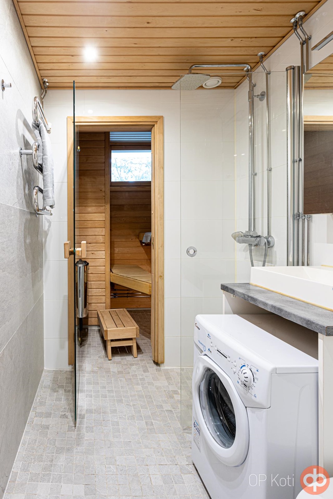 - Sauna, sähkökiuas, kylpyhuone, suihku, suihkuseinä, peilikaappi, pesukoneliitäntä, kiinteät valaisimet. Kylpyhuone ja sauna remontoitu 2020