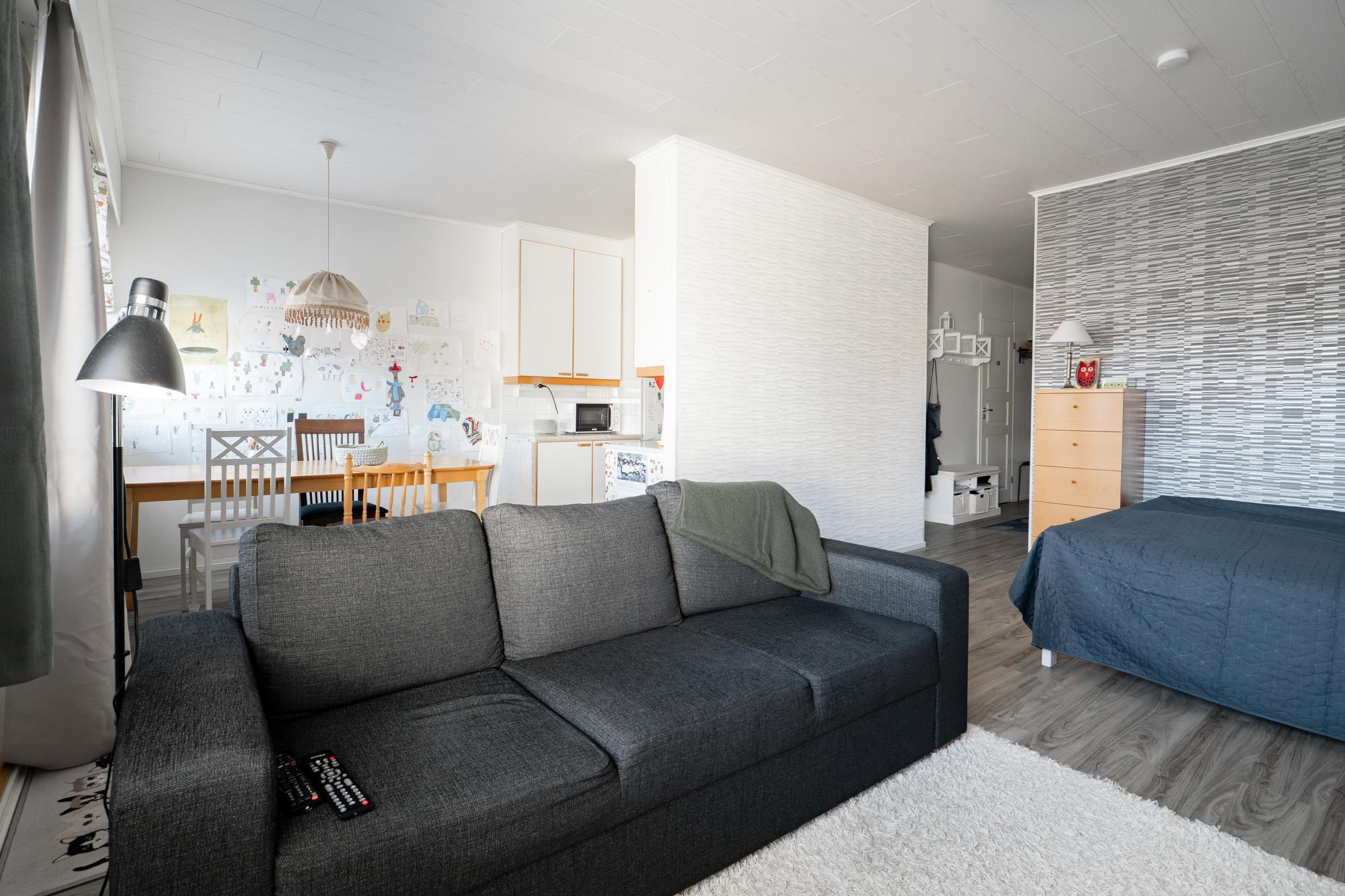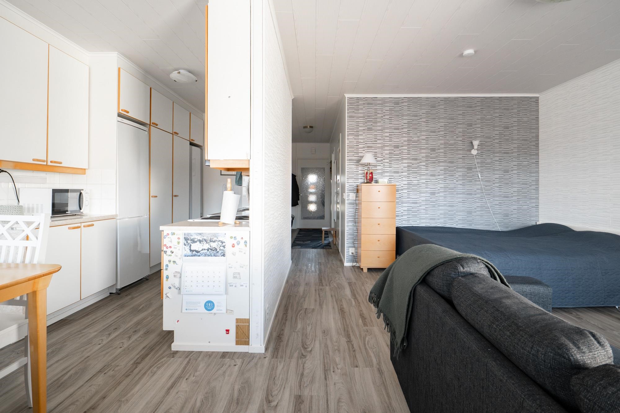 Keittiö: Vinyyli / maali. Olohuone: Vinyyli / maali+tapetti. Makuuhuone 1: Vinyyli / maali+tapetti. Sauna: Muovimatto/ paneeli. Kylpyhuone: Muovimatto / laatta.