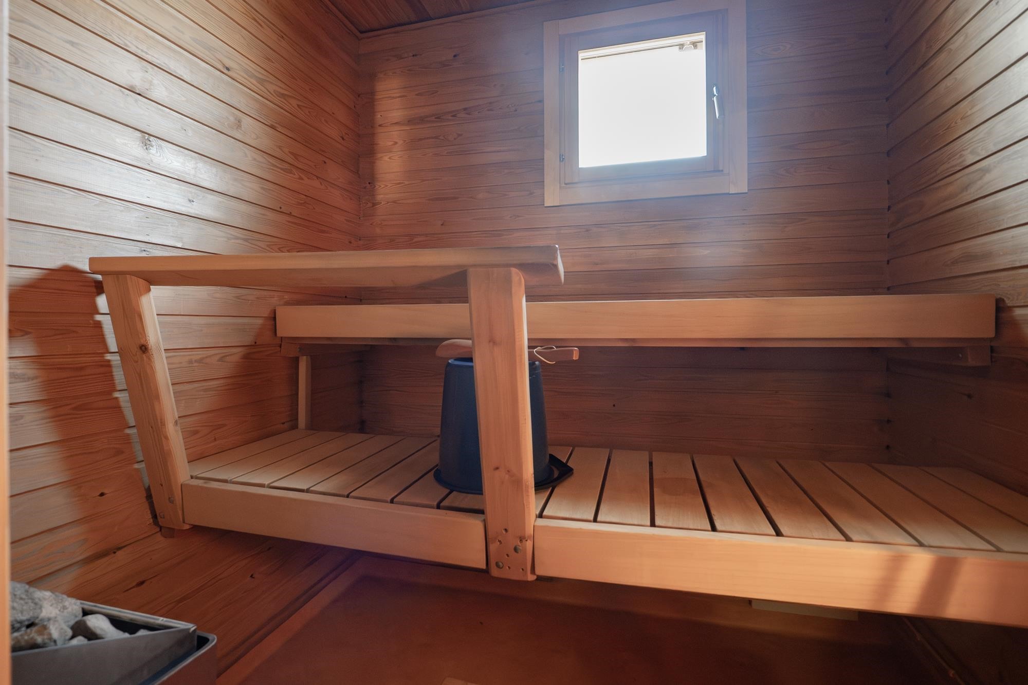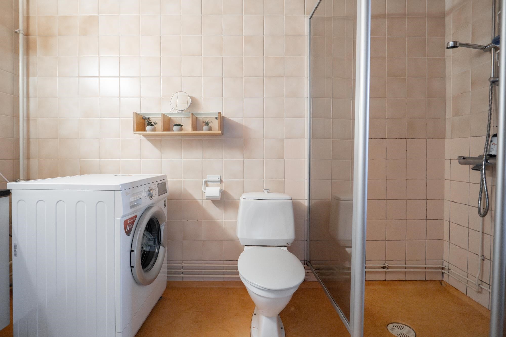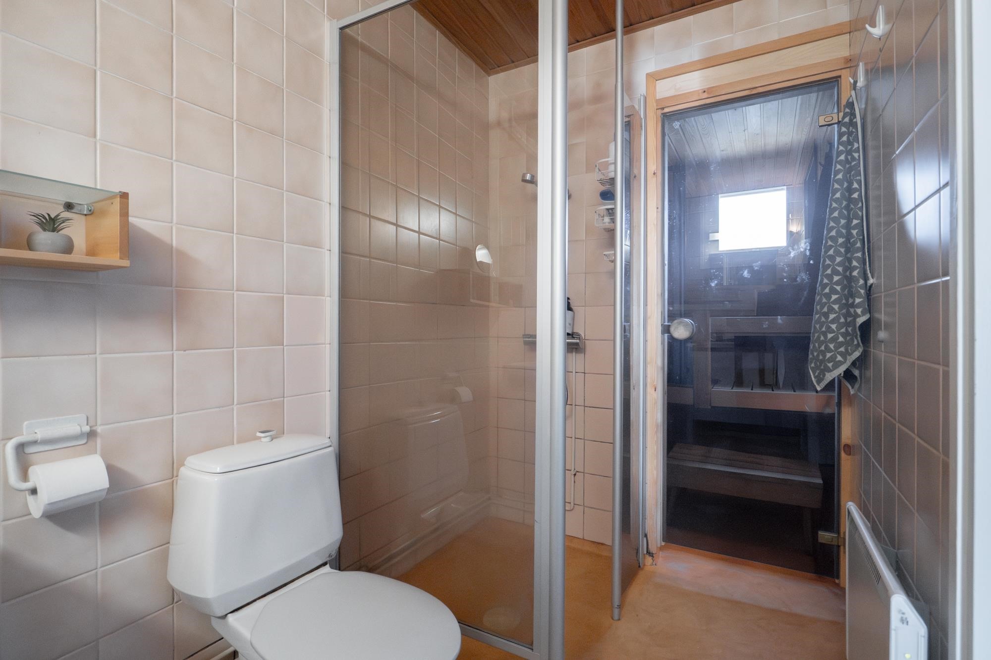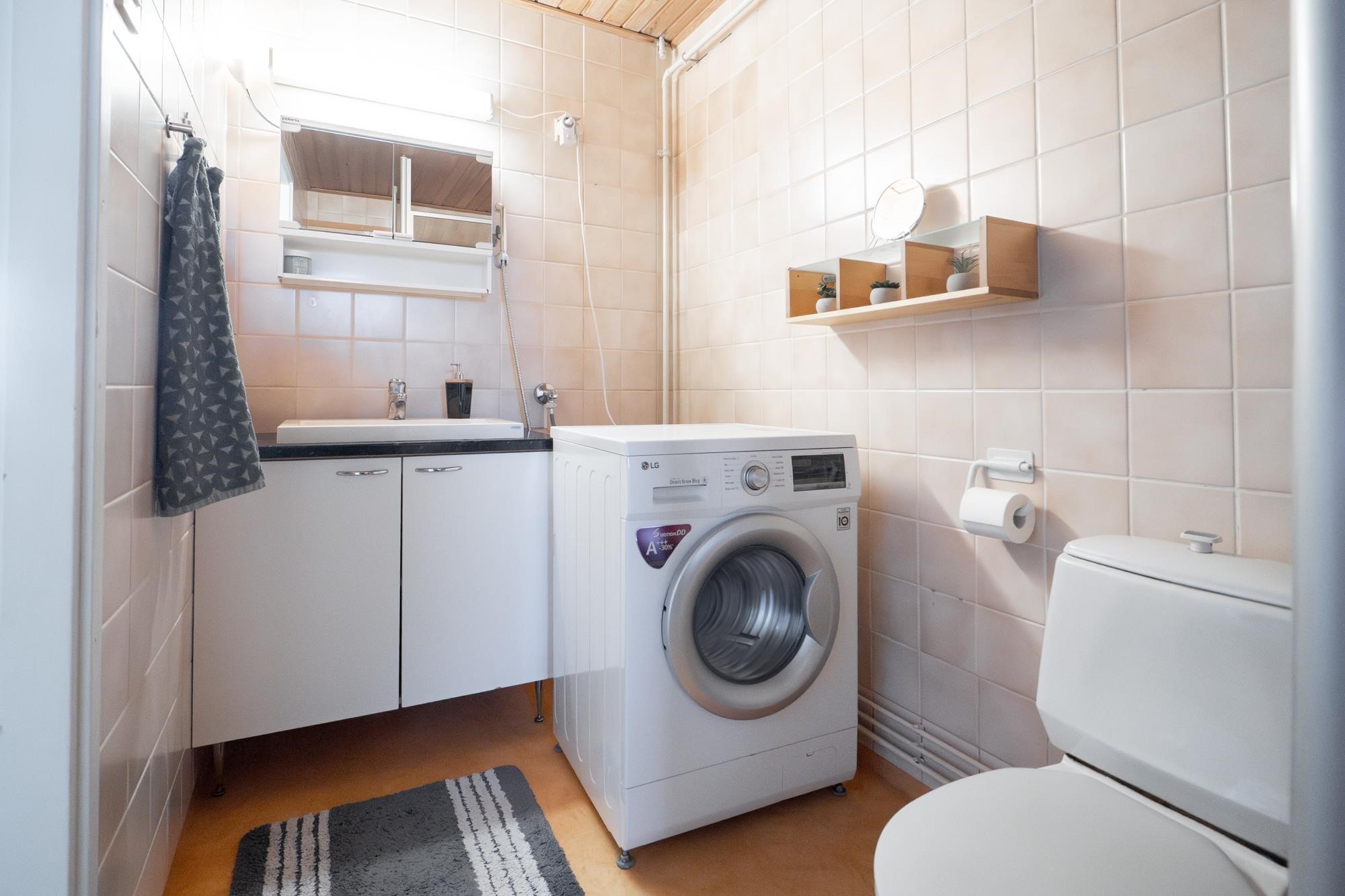 - Sauna, sähkökiuas, kylpyhuone, suihku, suihkuseinä, peilit, peilikaappi, kaapit, pesukoneliitäntä, kiinteät valaisimet.
