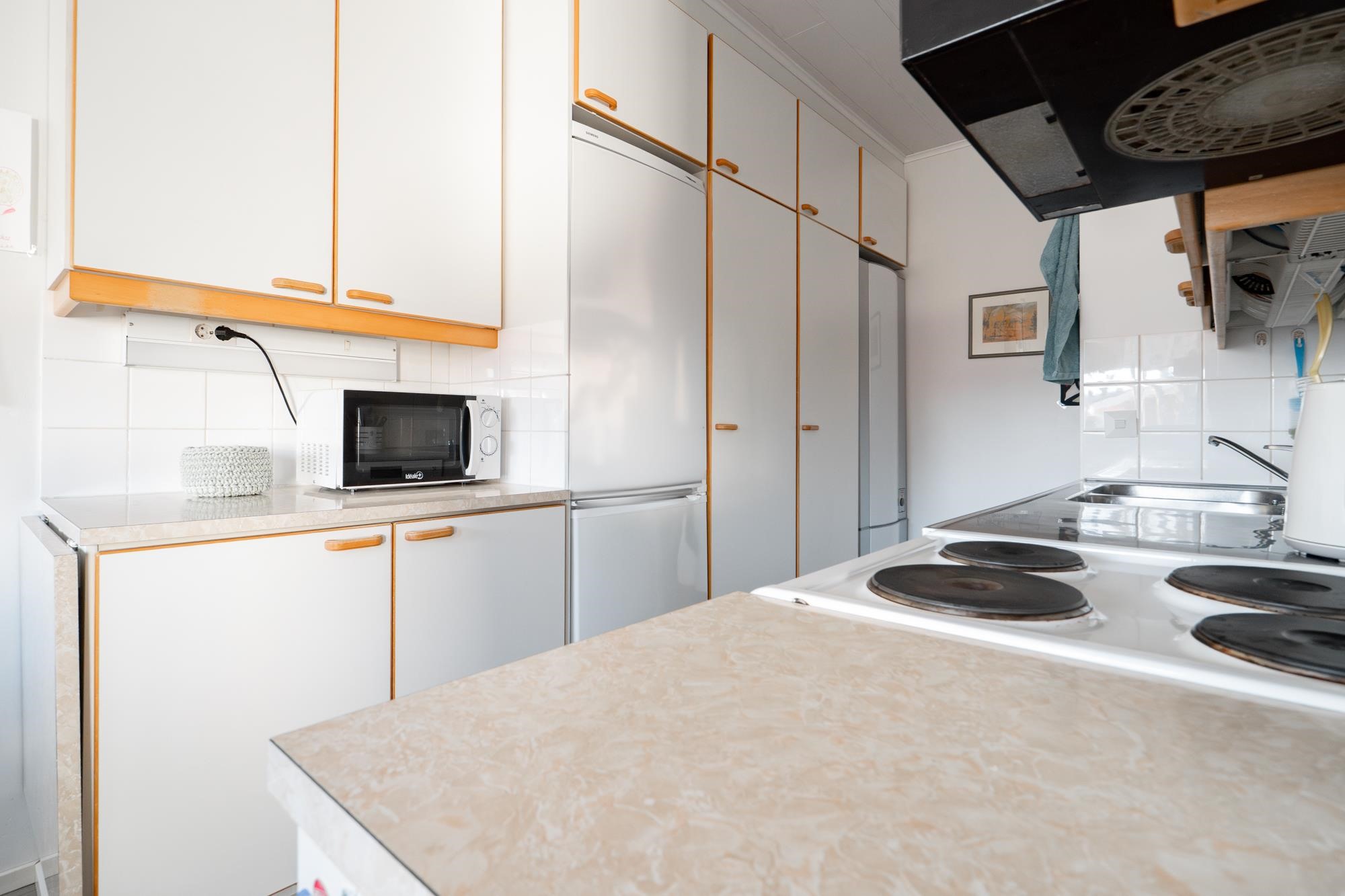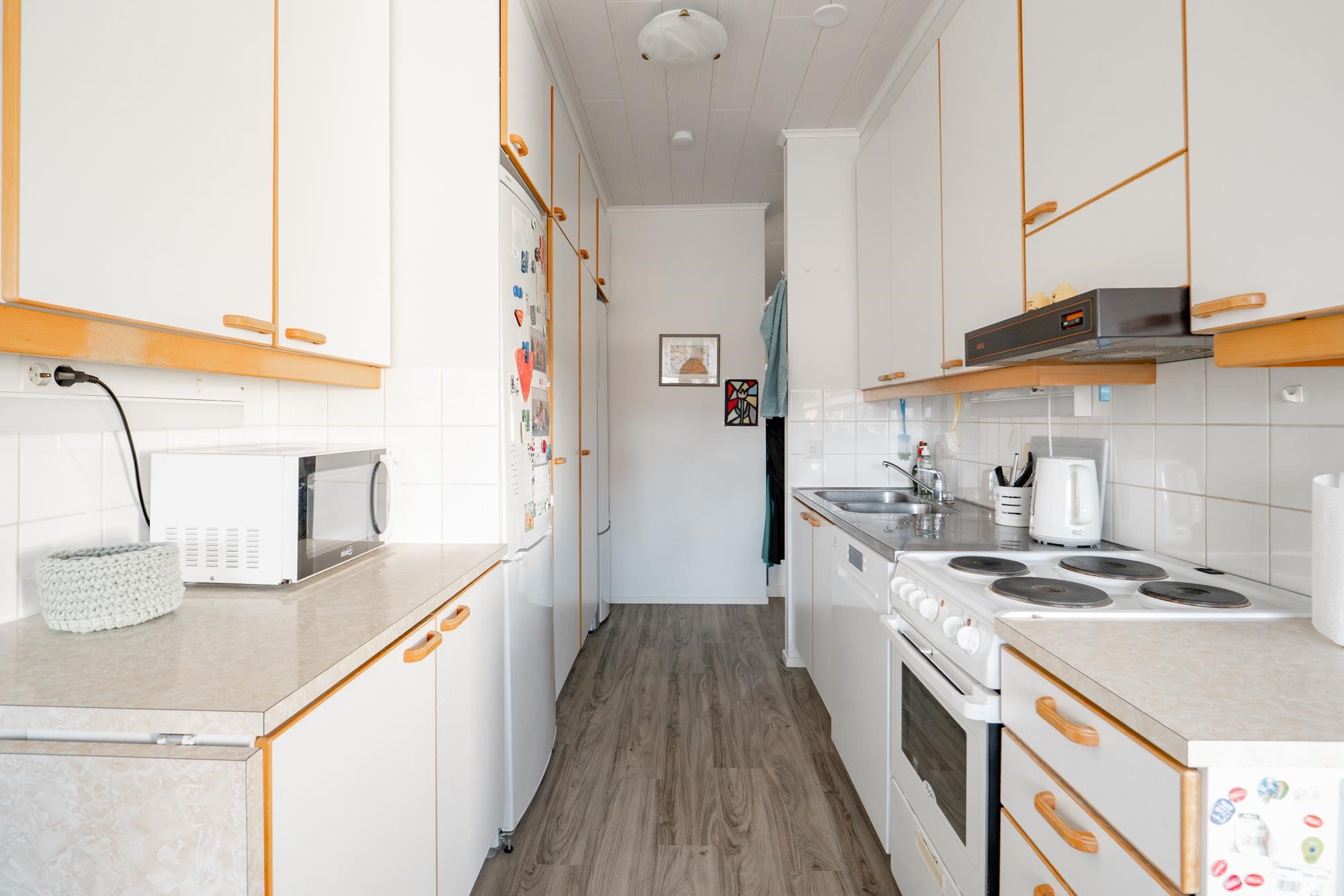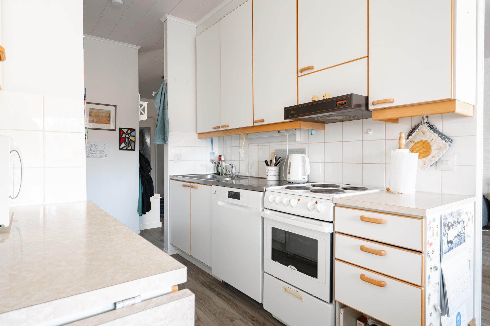 - Jääkaappipakastin, sähköliesi, liesituuletin, astianpesukone, kaapistot, kiinteät valaisimet.