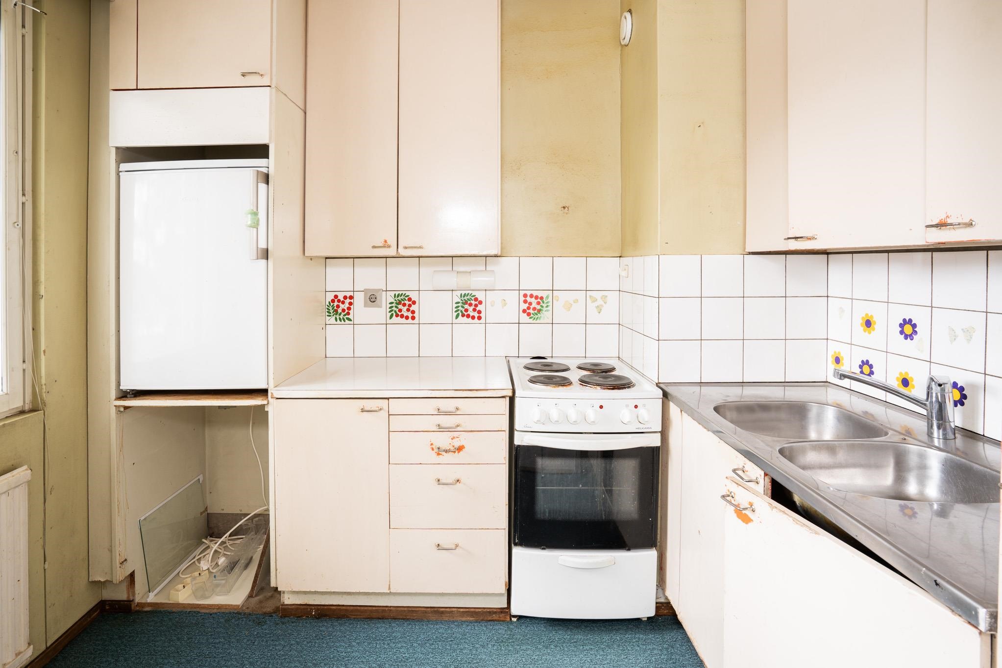 - Jääkaappi, sähköliesi, kaapistot, kiinteät valaisimet.