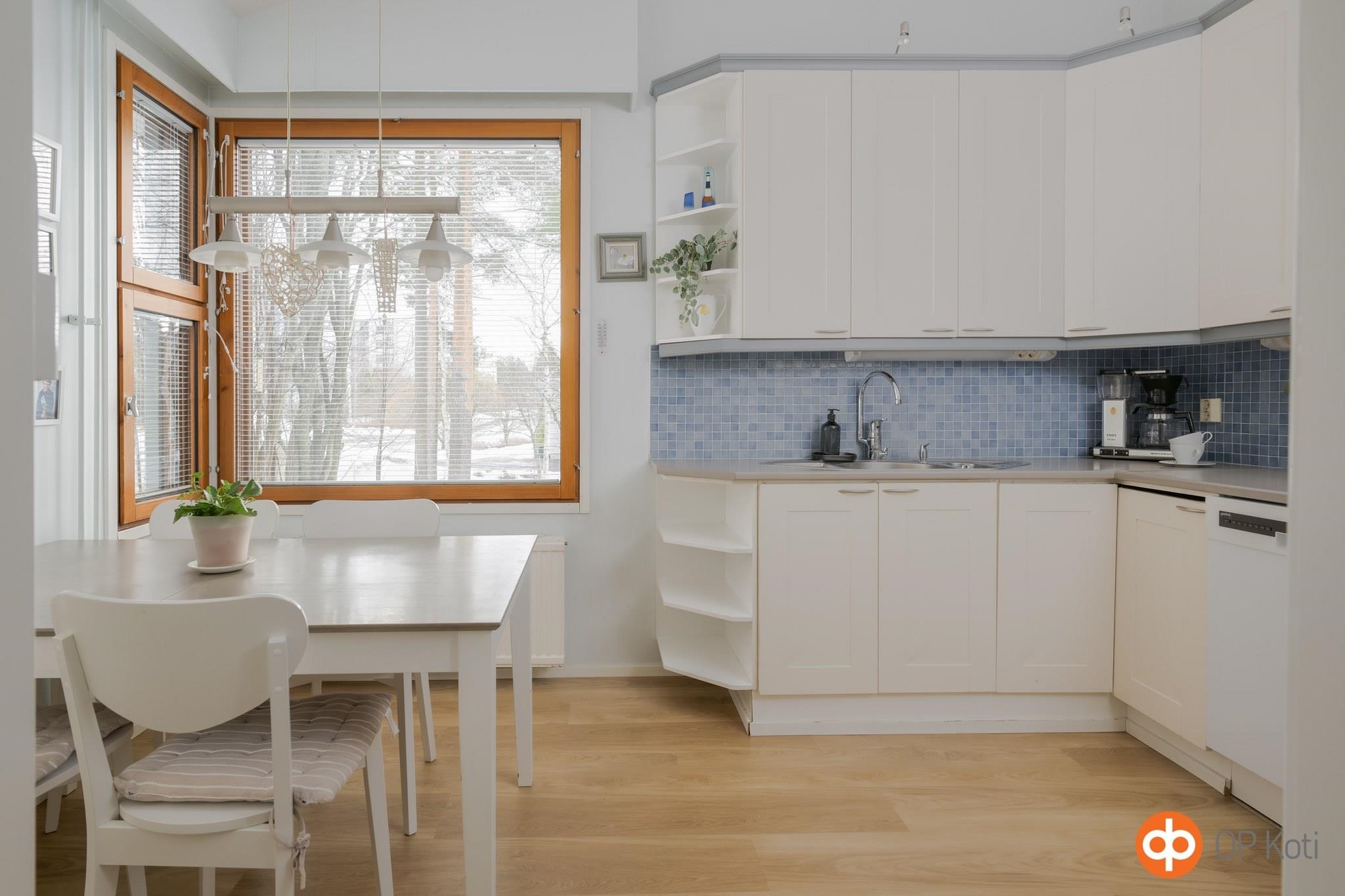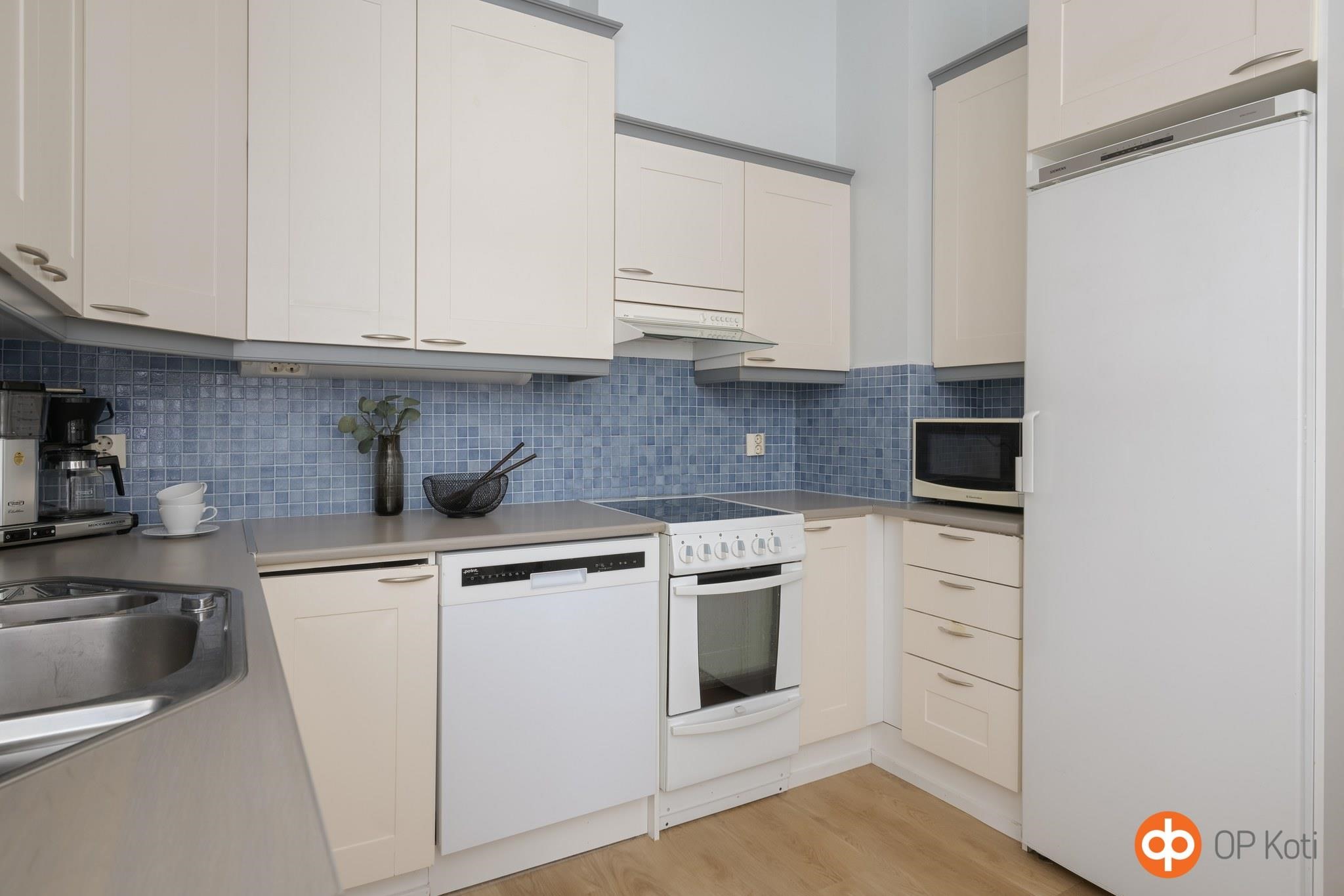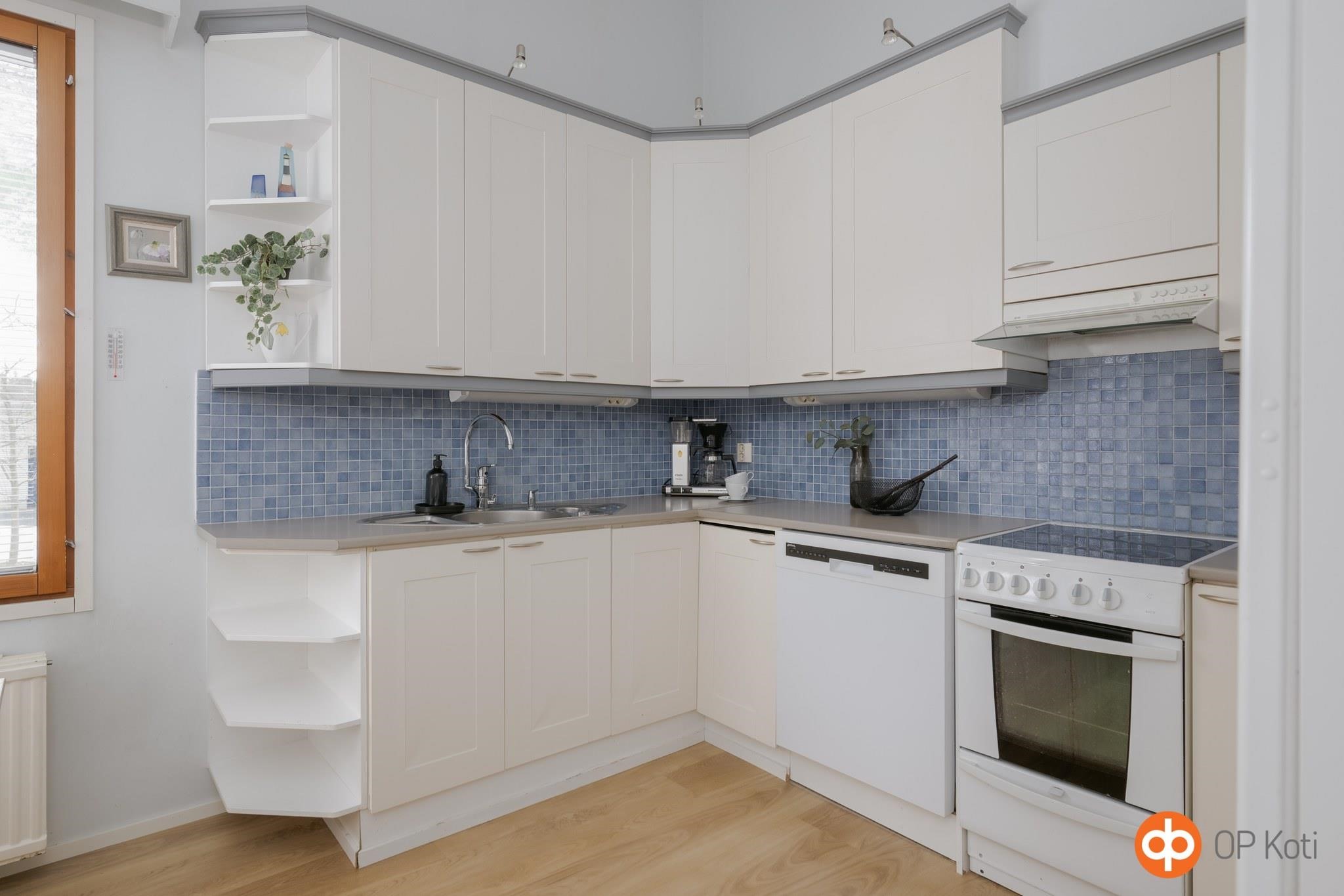 - Jääkaappi, pakastekaappi, liesitaso, keraaminen liesi, liesituuletin, astianpesukone, kaapistot, kiinteät valaisimet.