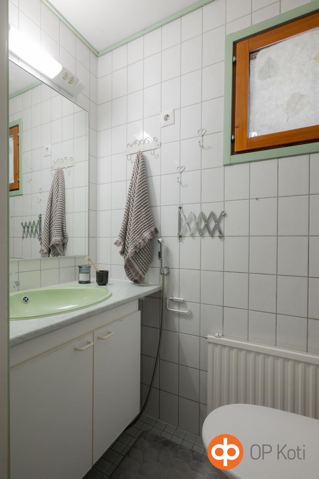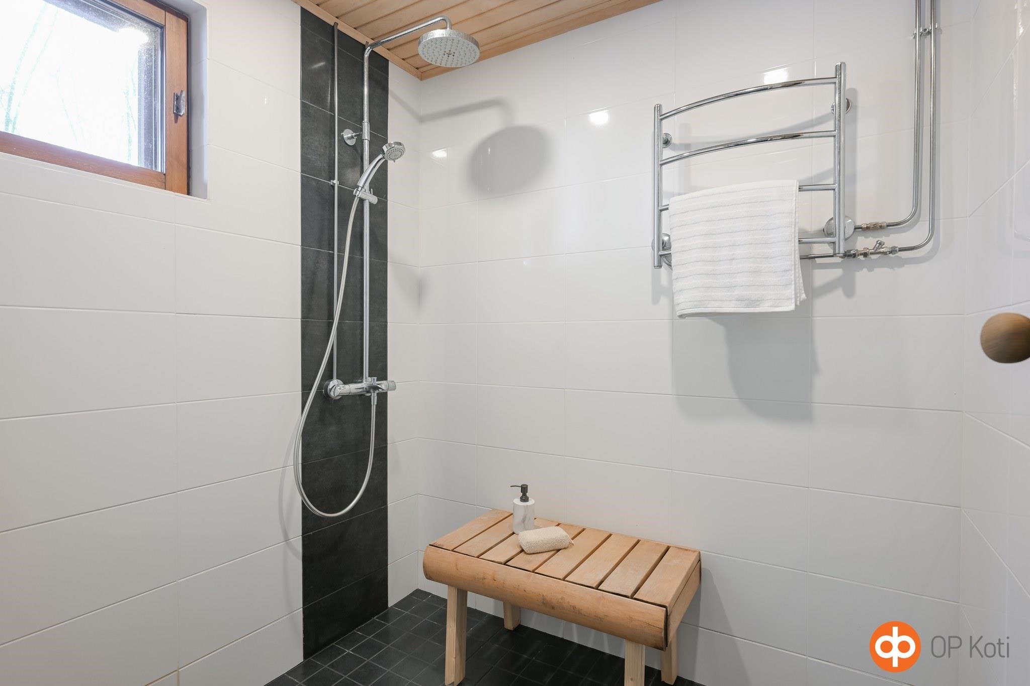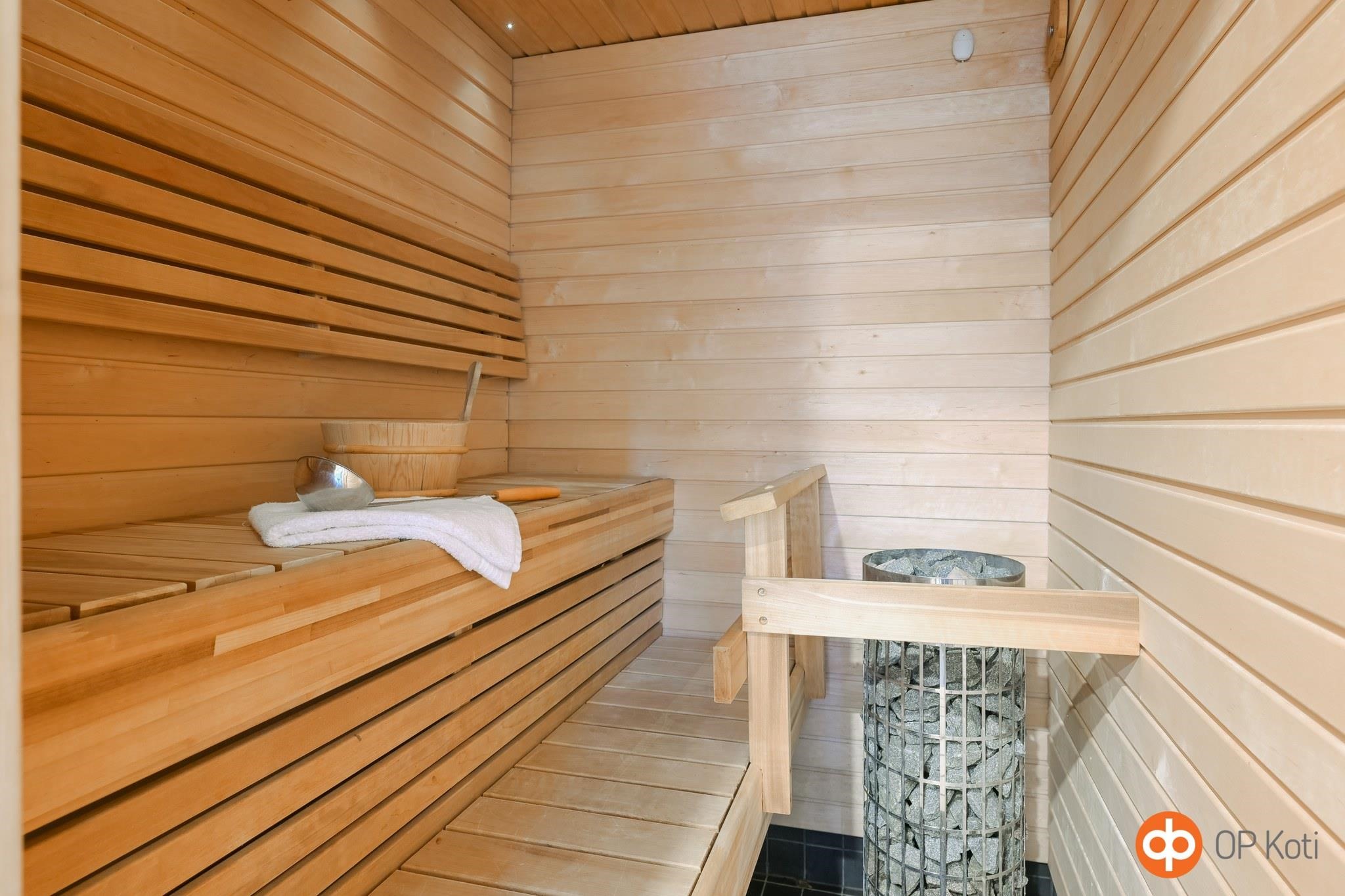 - Sauna, sähkökiuas, kylpyhuone, erillinen wc, suihku, peilit molemmissa wc, allaskaappi, pesukoneliitäntä (khh), lattialämmitys khh,kh,s, kiinteät valaisimet, rättipatteri.