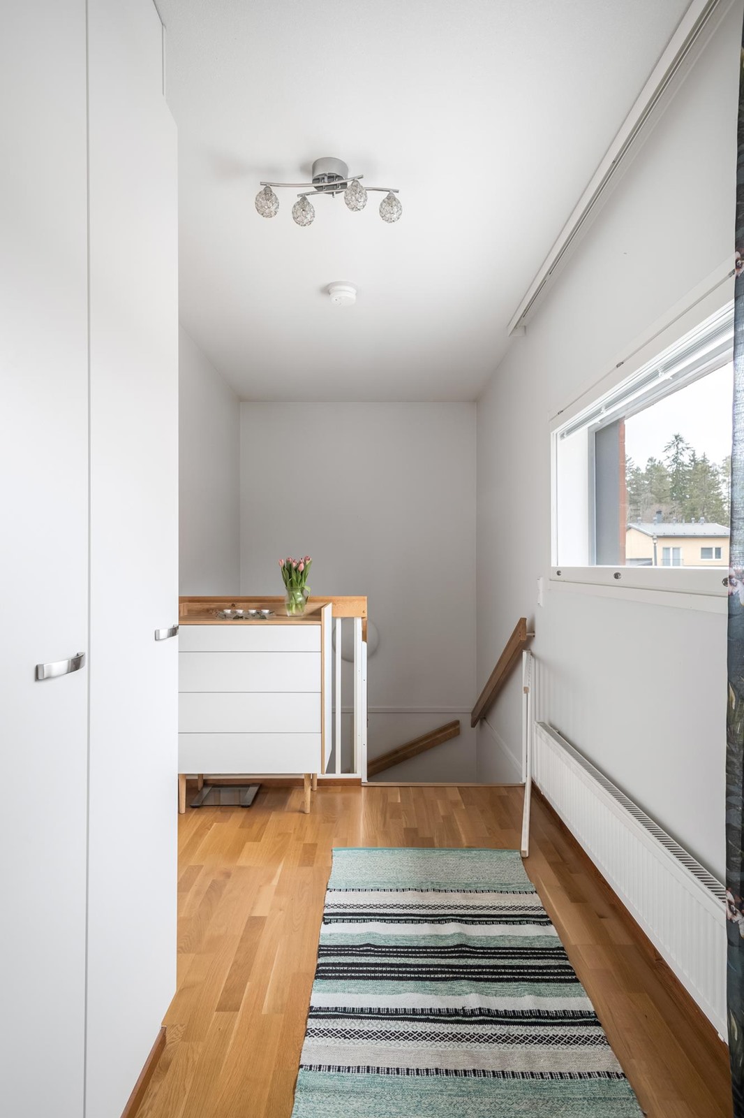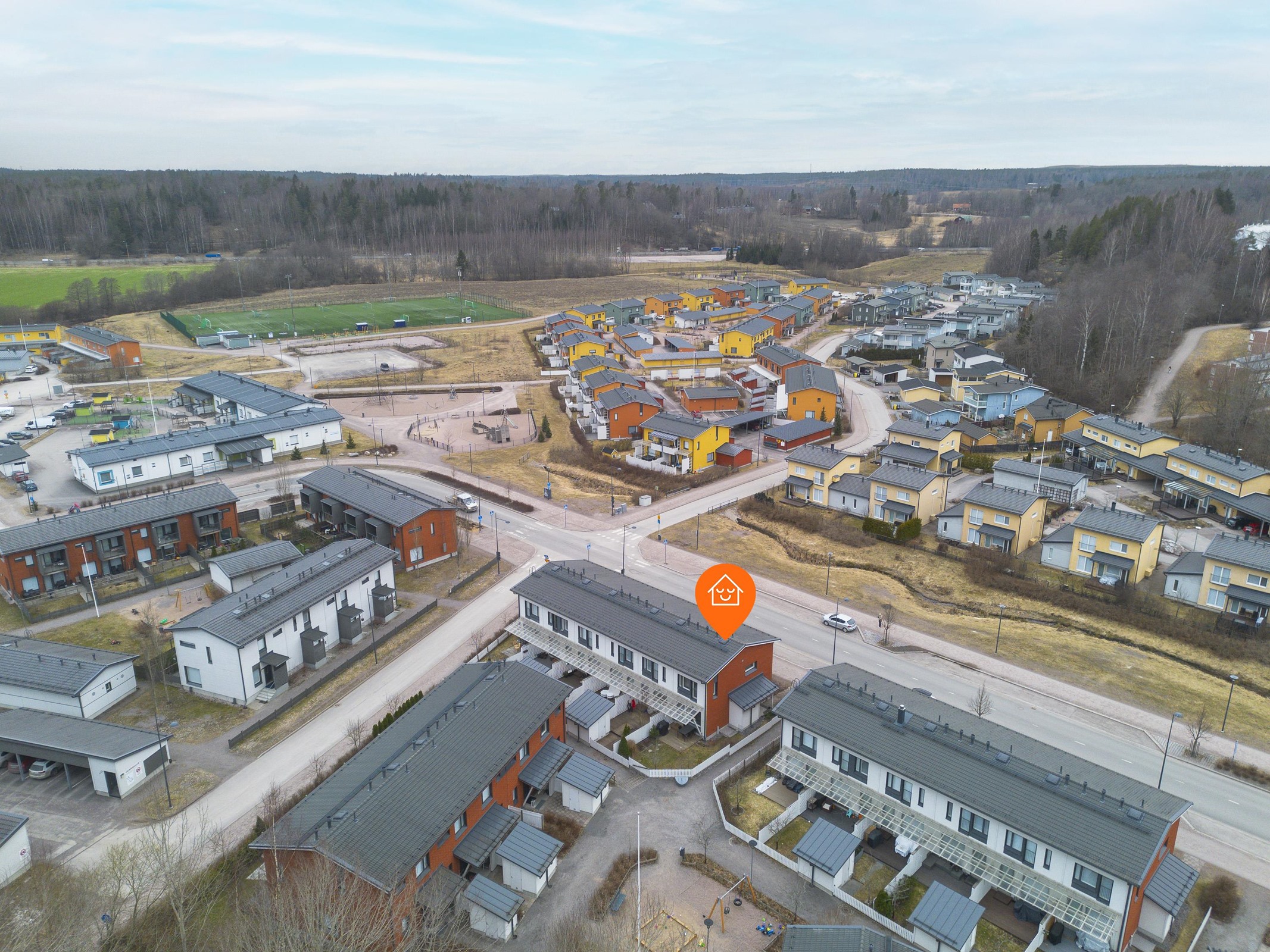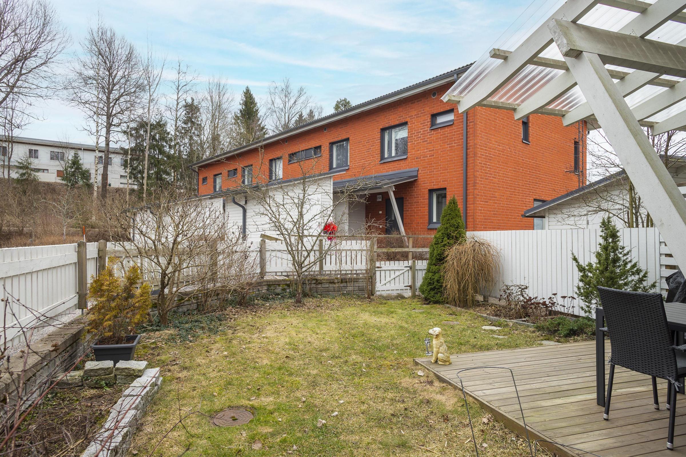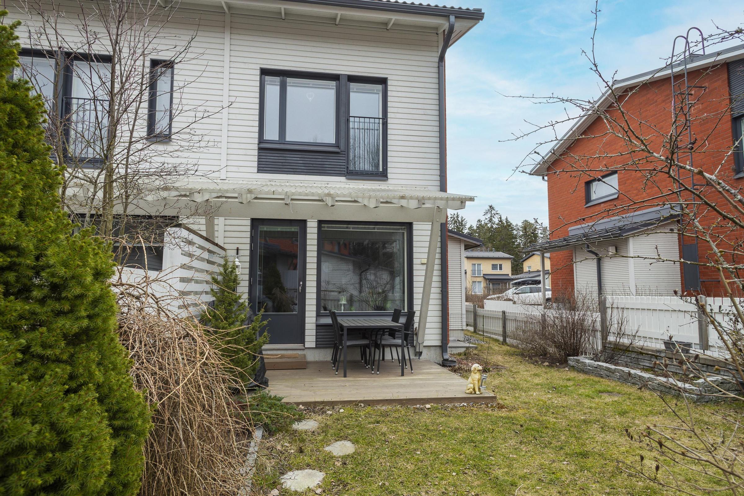 Vuonna 2013 valmistunut 63 neliömetrin rivitalon päätyhuoneisto kätkee sisäänsä valoisan ja kodikkaan olohuoneen, avokeittiön, kylpyhuoneen, saunan sekä makuuhuoneen. Asunnon pohjaratkaisu on käytännöllinen ja avara. Pesuhuoneesta löytyy tilat pesukoneelle ja kuivausrummulle, sopivan kokoinen sauna. Säilytystilaakin on riittävästi; sisäänkäynnin yhteydessä olevan ulkovaraston lisäksi asunnossa on vaatehuone. Alakerran portaikon kupeeseen saa hyvin mahtumaan etätyöpisteen. Terassi takapihalla sekä aidattu nurmikkoalue istutuksineen.