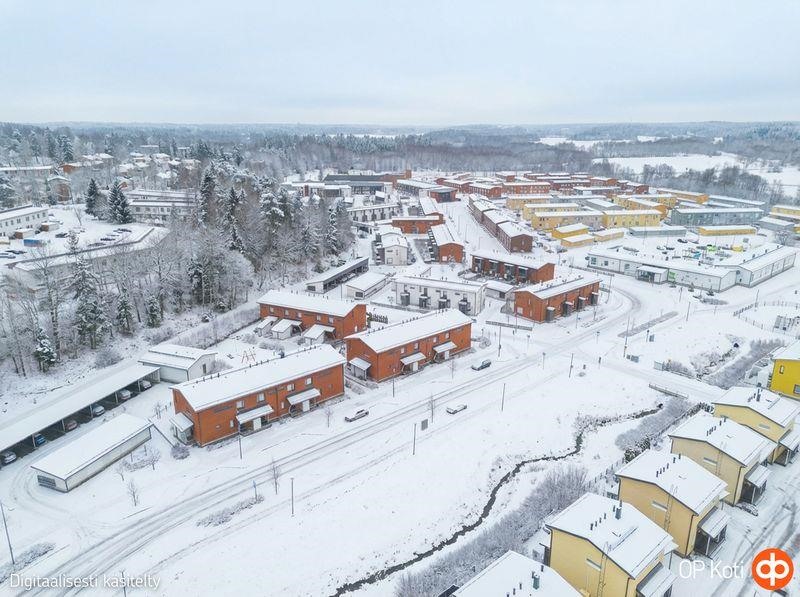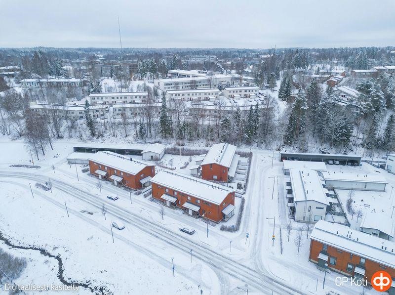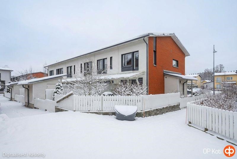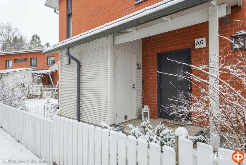 Vuonna 2013 valmistunut 63 neliömetrin rivitalon päätyhuoneisto kätkee sisäänsä valoisan ja kodikkaan olohuoneen, avokeittiön, kylpyhuoneen, saunan sekä makuuhuoneen. Asunnon pohjaratkaisu on käytännöllinen ja avara. Pesuhuoneesta löytyy tilat pesukoneelle ja kuivausrummulle, suihkutilassa on seinäke, sopivan kokoinen sauna. Säilytystilaakin on riittävästi; sisäänkäynnin yhteydessä olevan ulkovaraston lisäksi asunnossa on vaatehuone. Alakerran portaikon kupeeseen saa hyvin mahtumaan etätyöpisteen. Terassi takapihalla sekä aidattu nurmikkoalue istutuksineen.