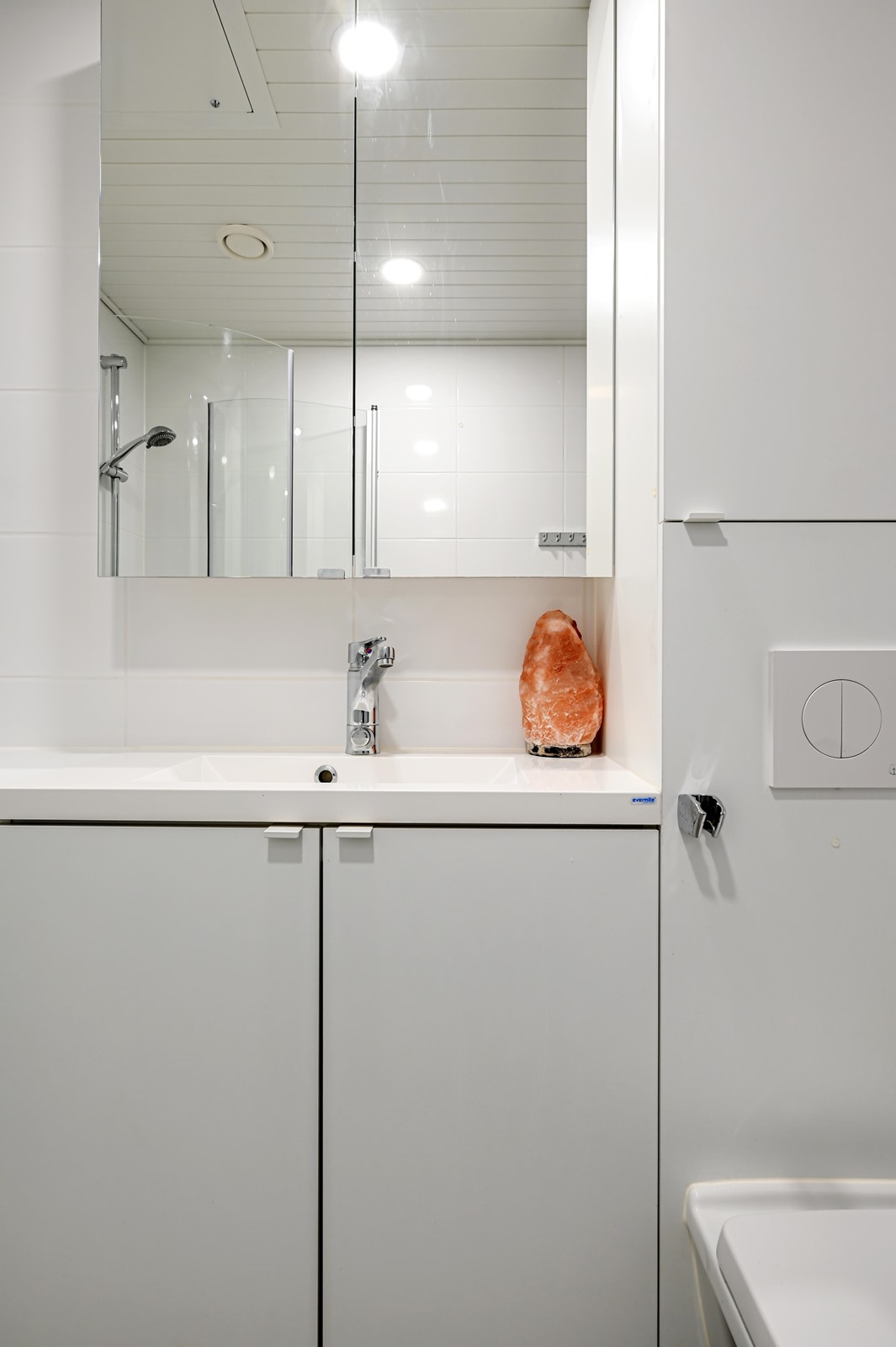 - Kylpyhuone, suihku, suihkuseinä (kääntyvät suihkuseinät), peilikaappi, pesukoneliitäntä, lattialämmitys, kiinteät valaisimet.