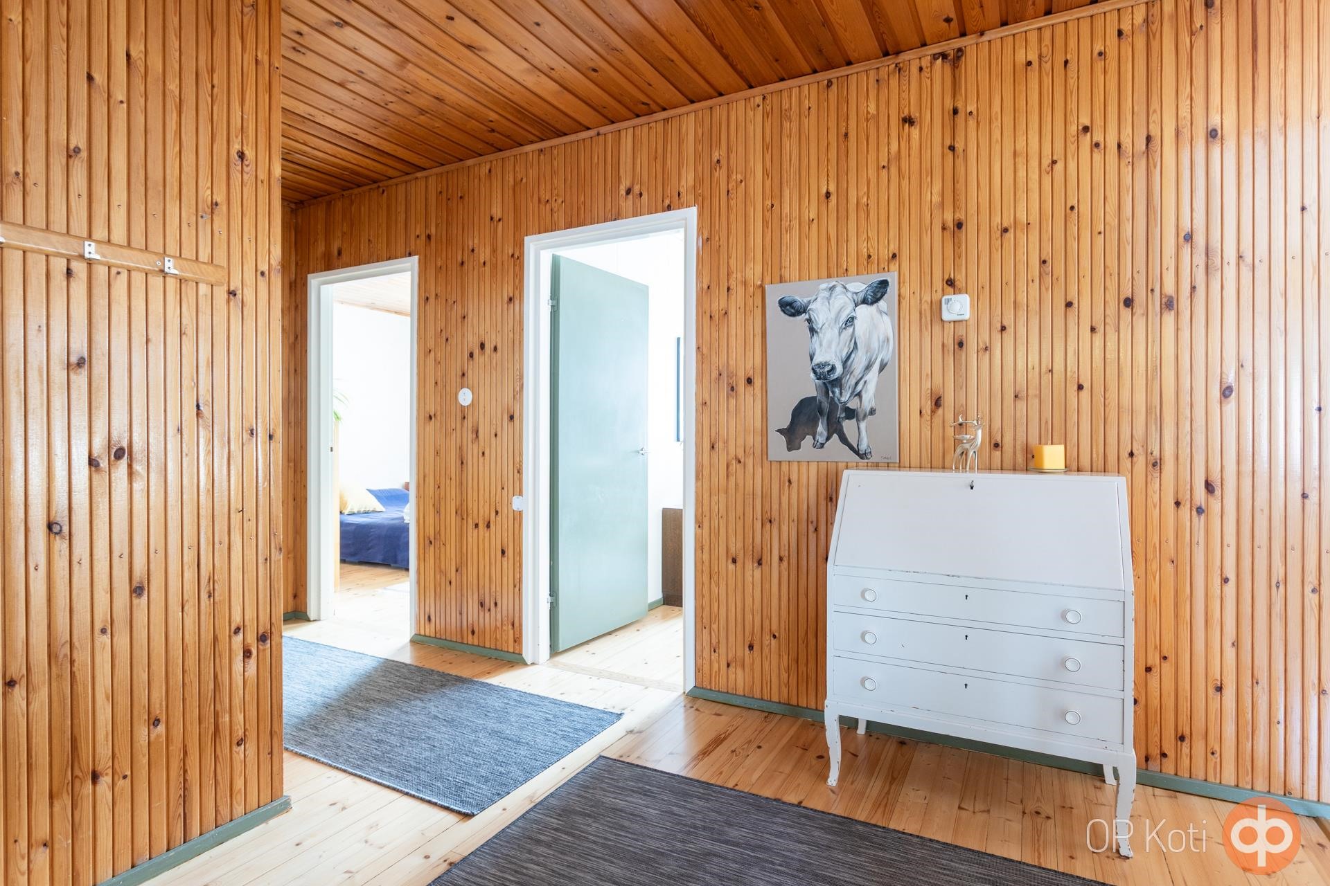 Viehättävät puulattiat ovat siistikuntoiset, seinäpinnat ovat paneelia ja makuuhuoneissa sekä olohuoneessa tapetti- ja maalia. Puulattiat on hiottu ja lakattu vuonna 2012, olohuoneeseen ja keittiöön on asennettu parketit vuonna 2007, samalla tapetoitu seinät.
