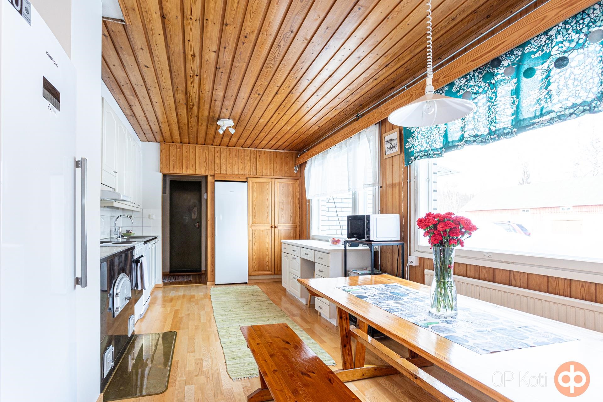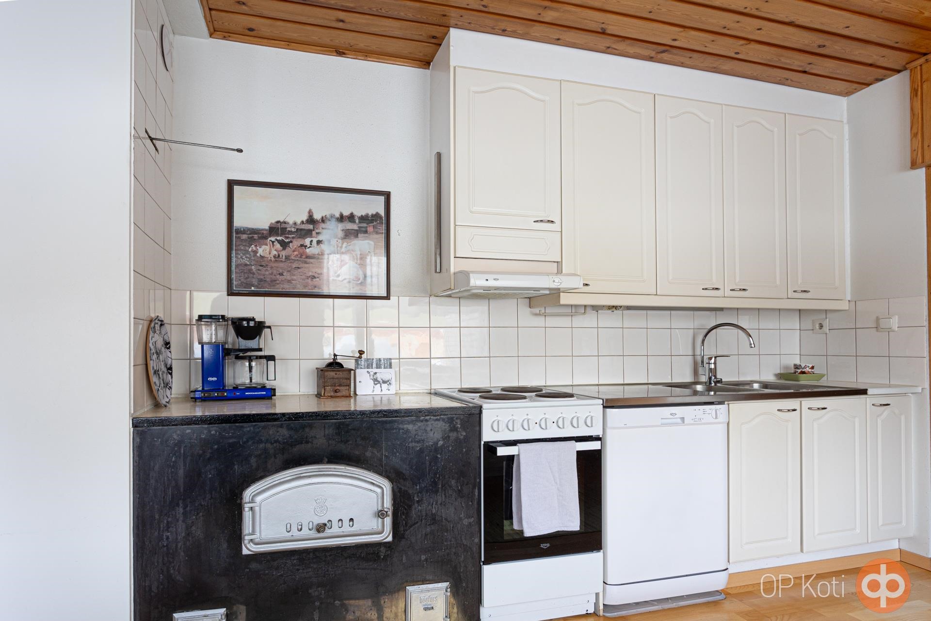 - Jääkaappi (v. 2021), sähköliesi (v. 2019), liesituuletin, astianpesukone, kaapistot, kiinteät valaisimet. Matala leivinuuni/hella