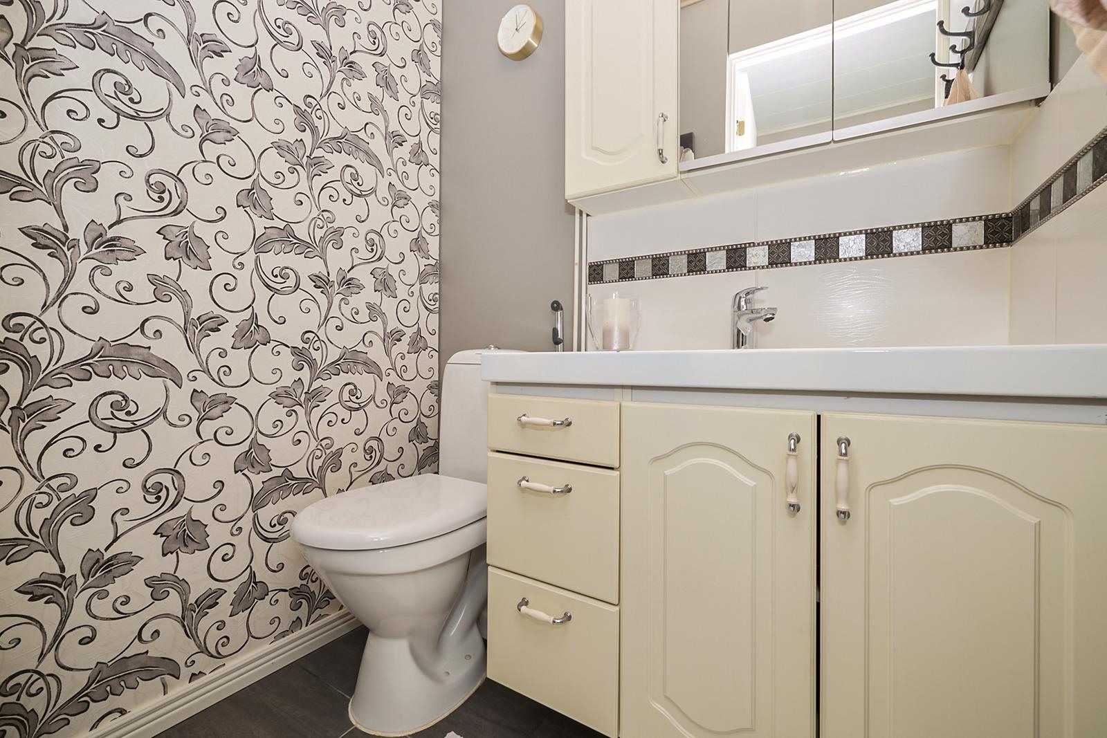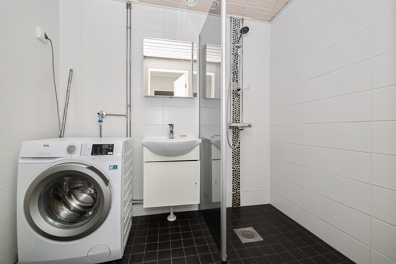 - Sauna, sähkökiuas, kylpyhuone, erillinen wc, peilit, peilikaappi, kaapit, allaskaappi, pesukoneliitäntä, lattialämmitys kylpyhuoneessa, kiinteät valaisimet. Saunaosasto remontoitu 2014