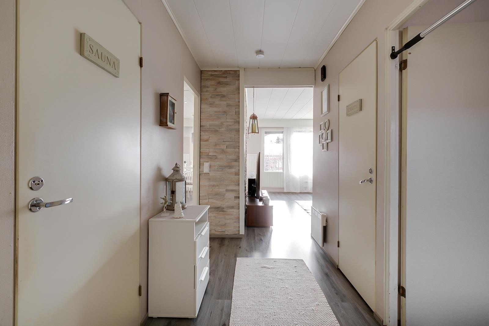 Keittiö: maalia, laminaattia. Olohuone: maalia, laminaattia. Makuuhuone 1: maalia, laminaattia. Sauna: paneelia, laattaa. Kylpyhuone: kaakelia, laattaa. Eteinen: maalia, laminaattia. Wc: maali,tapettia, laattaa.