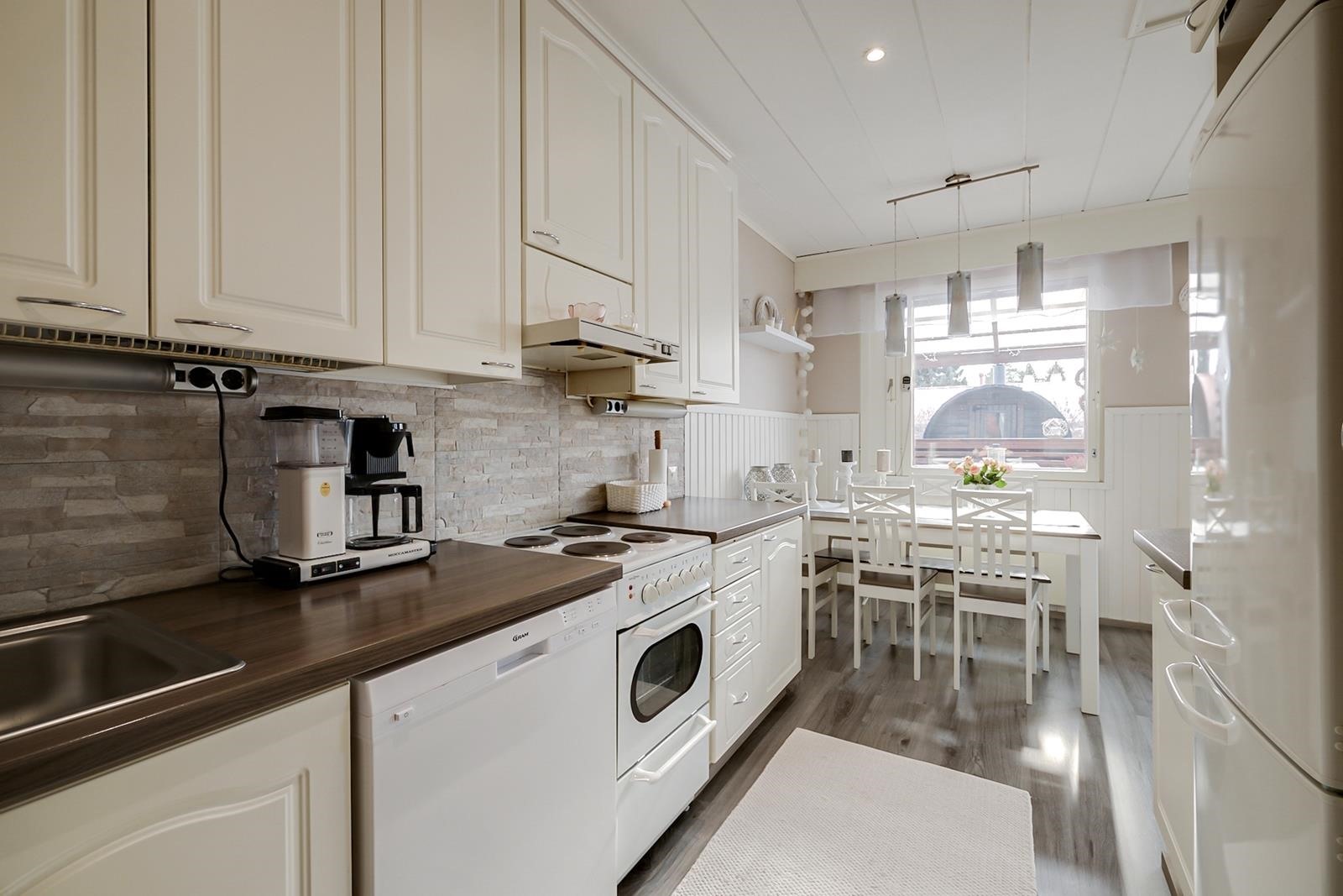 - Jääkaappipakastin, sähköliesi, liesituuletin, astianpesukone 2022, kaapistot, kiinteät valaisimet. Tasot, välitila ja osa runkoista uusittu 2012