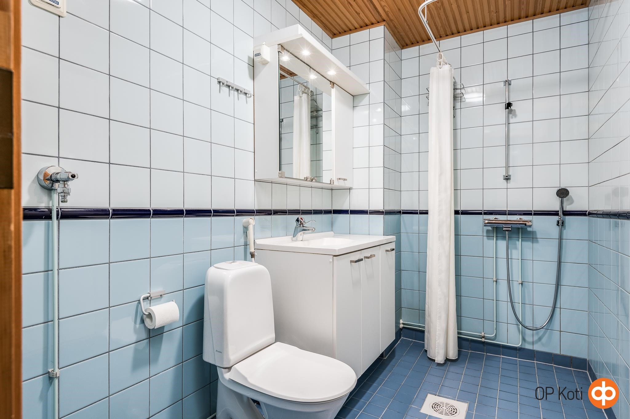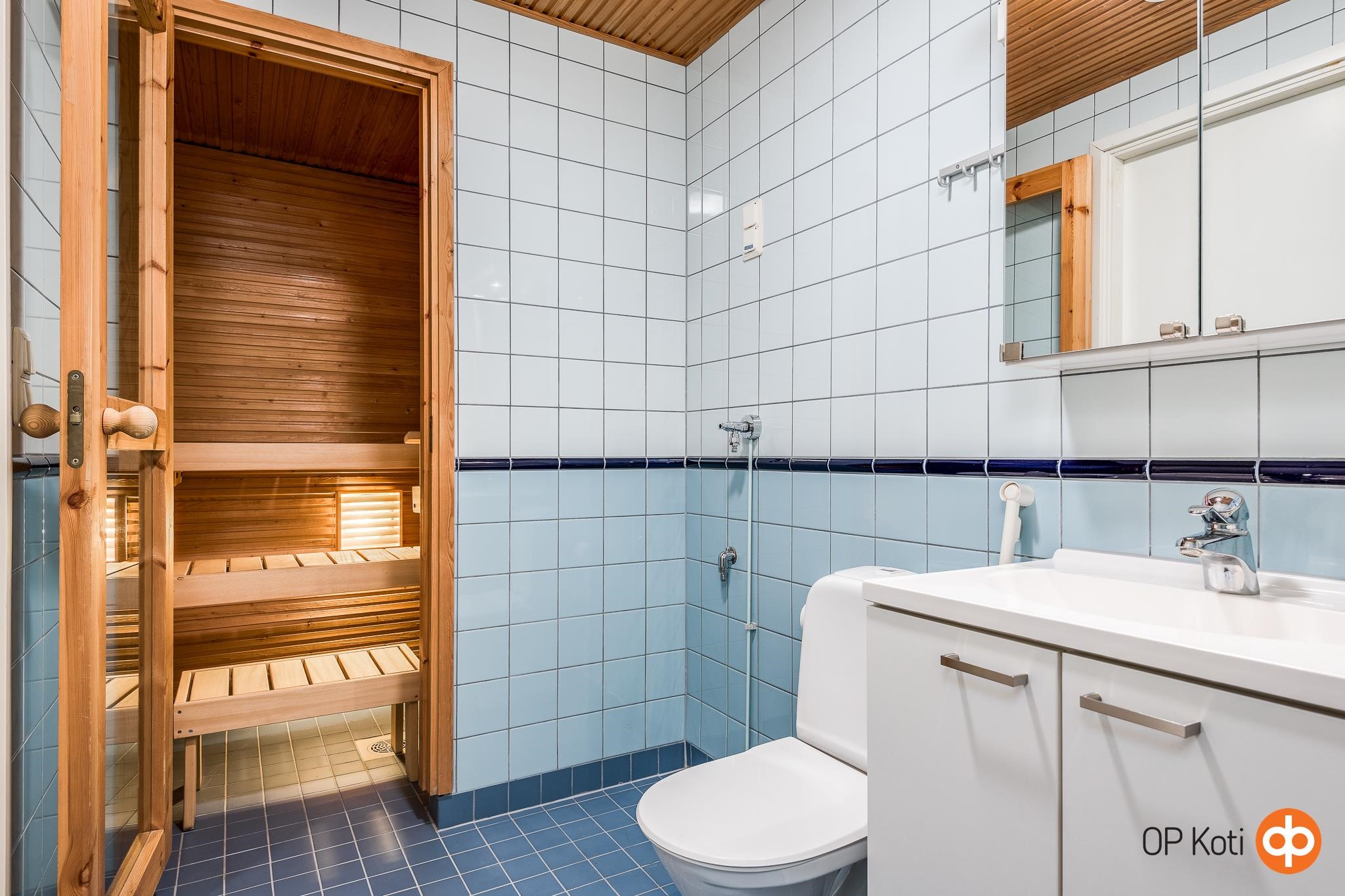 - Sauna, sähkökiuas, suihku, peilikaappi, allaskaappi, pesukoneliitäntä, lattialämmitys, kiinteät valaisimet.