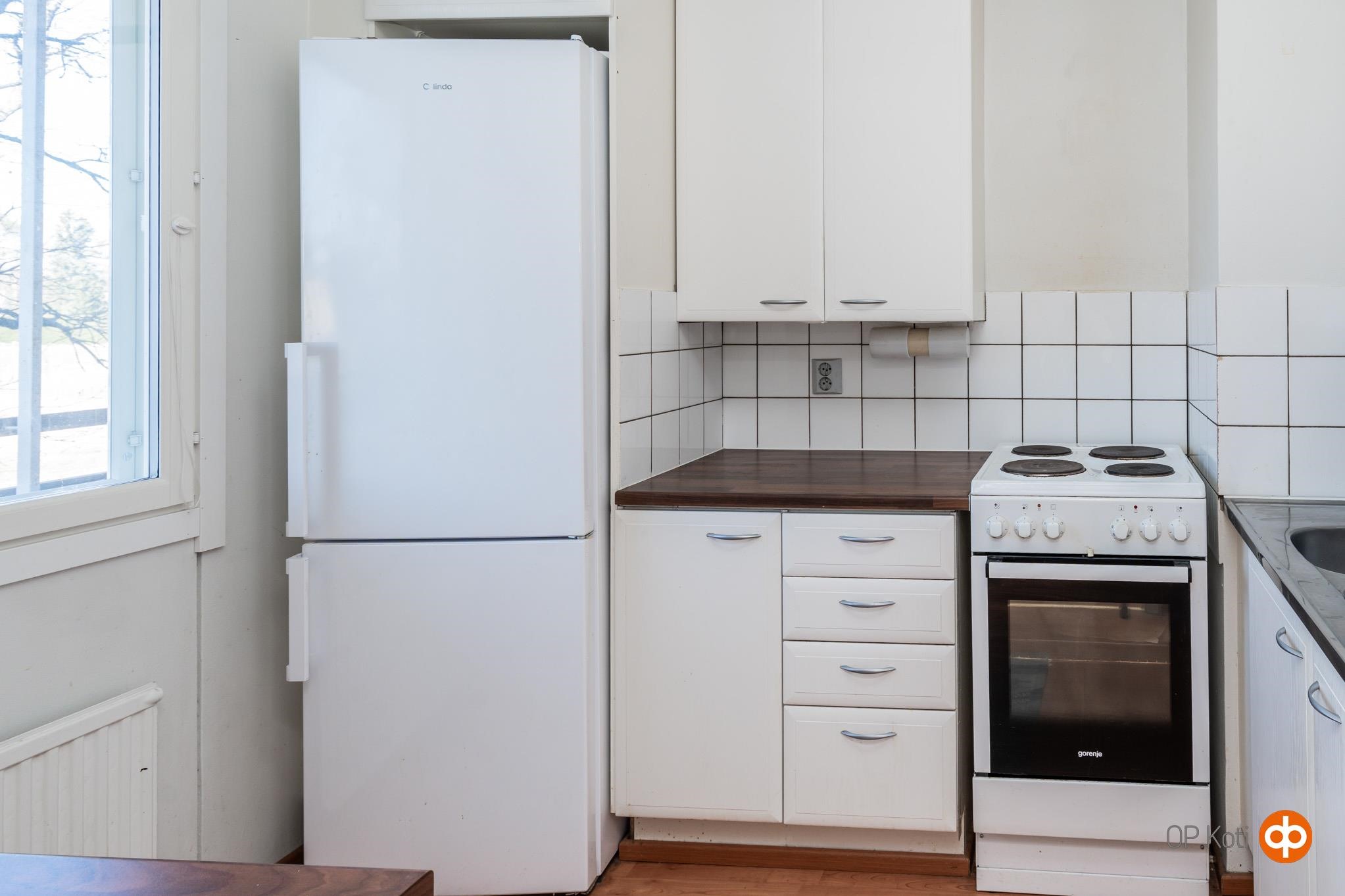 - Jääkaappipakastin, sähköliesi, kaapistot, kiinteät valaisimet.