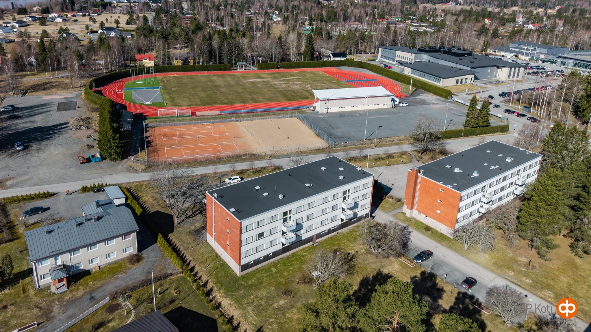 - Ikkunat länsisuuntaan ja näkymät urheilukentälle.